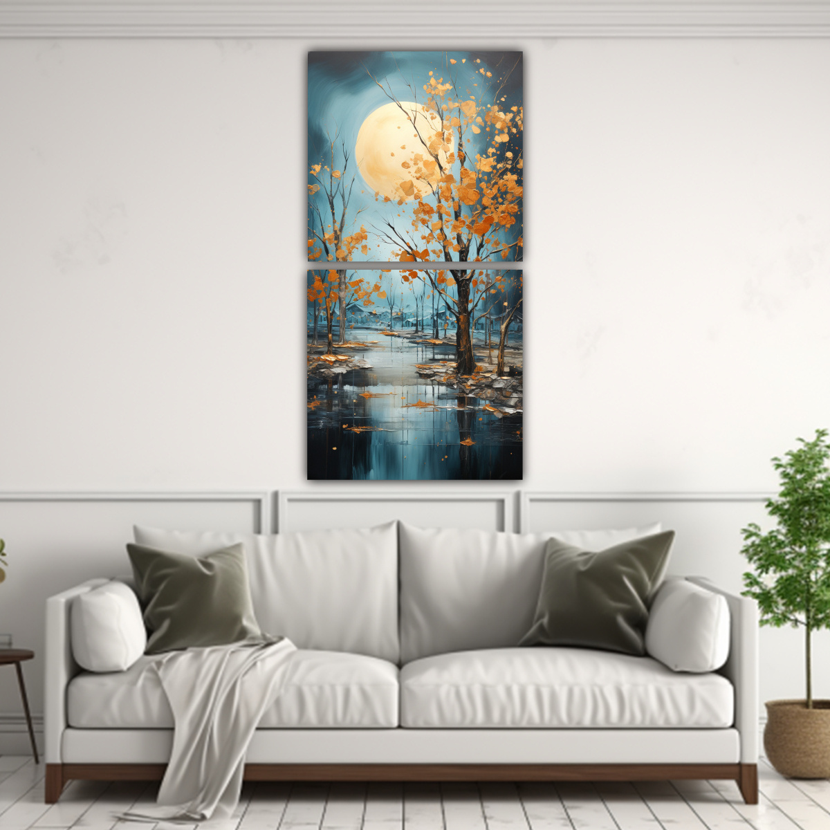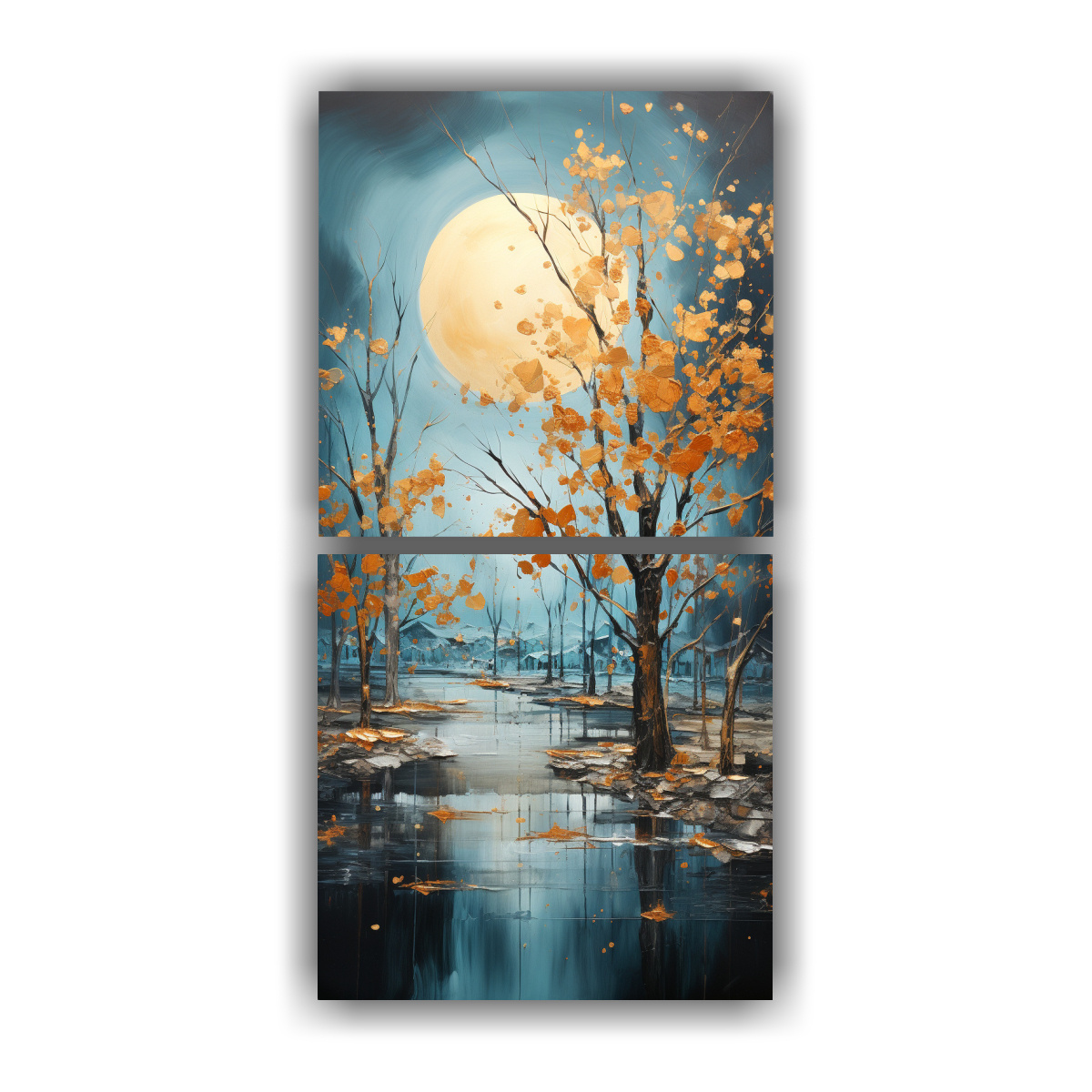 Pintura Abstracta De árboles En Plata Y Oro Con Armonía De Colores En Dos Lienzos De Tela