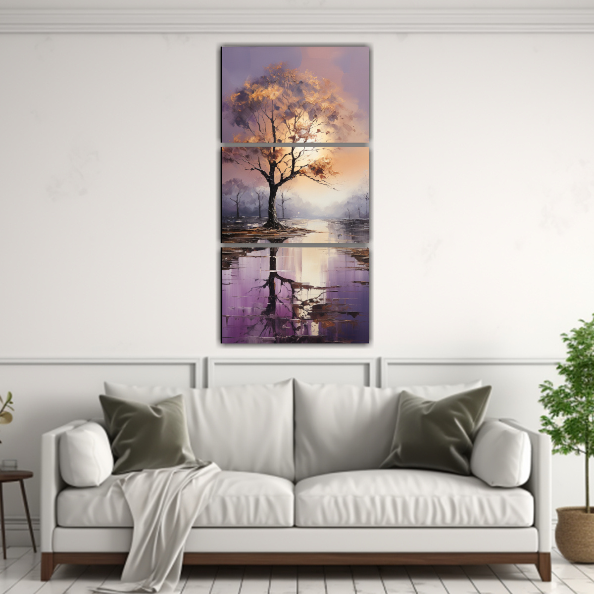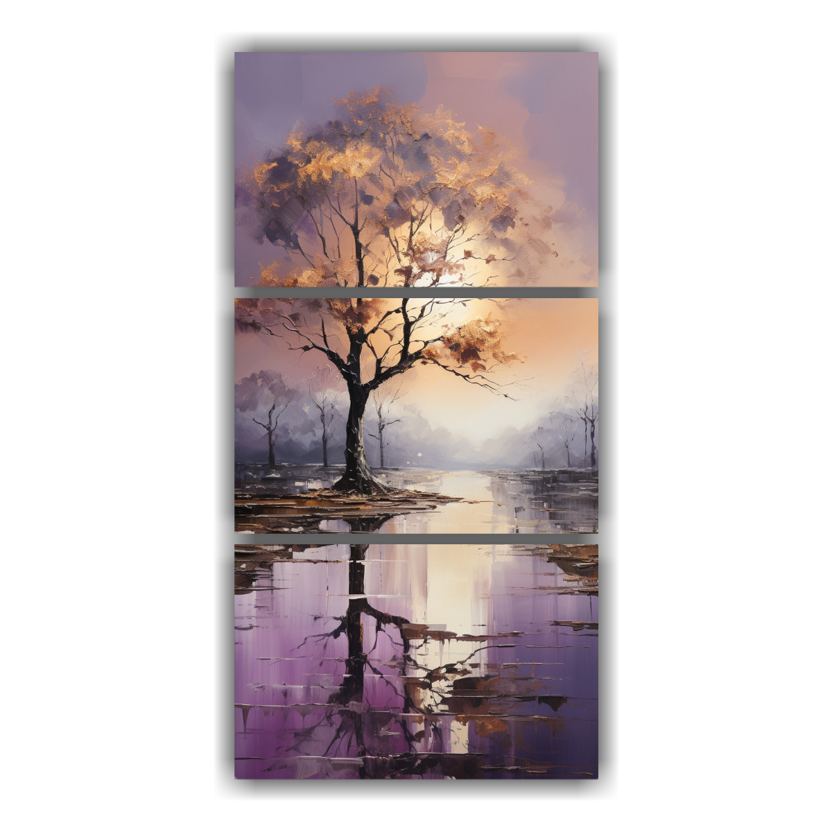 Pintura Abstracta De árboles En Plata Y Oro Con Esquema Tríptico Vertical