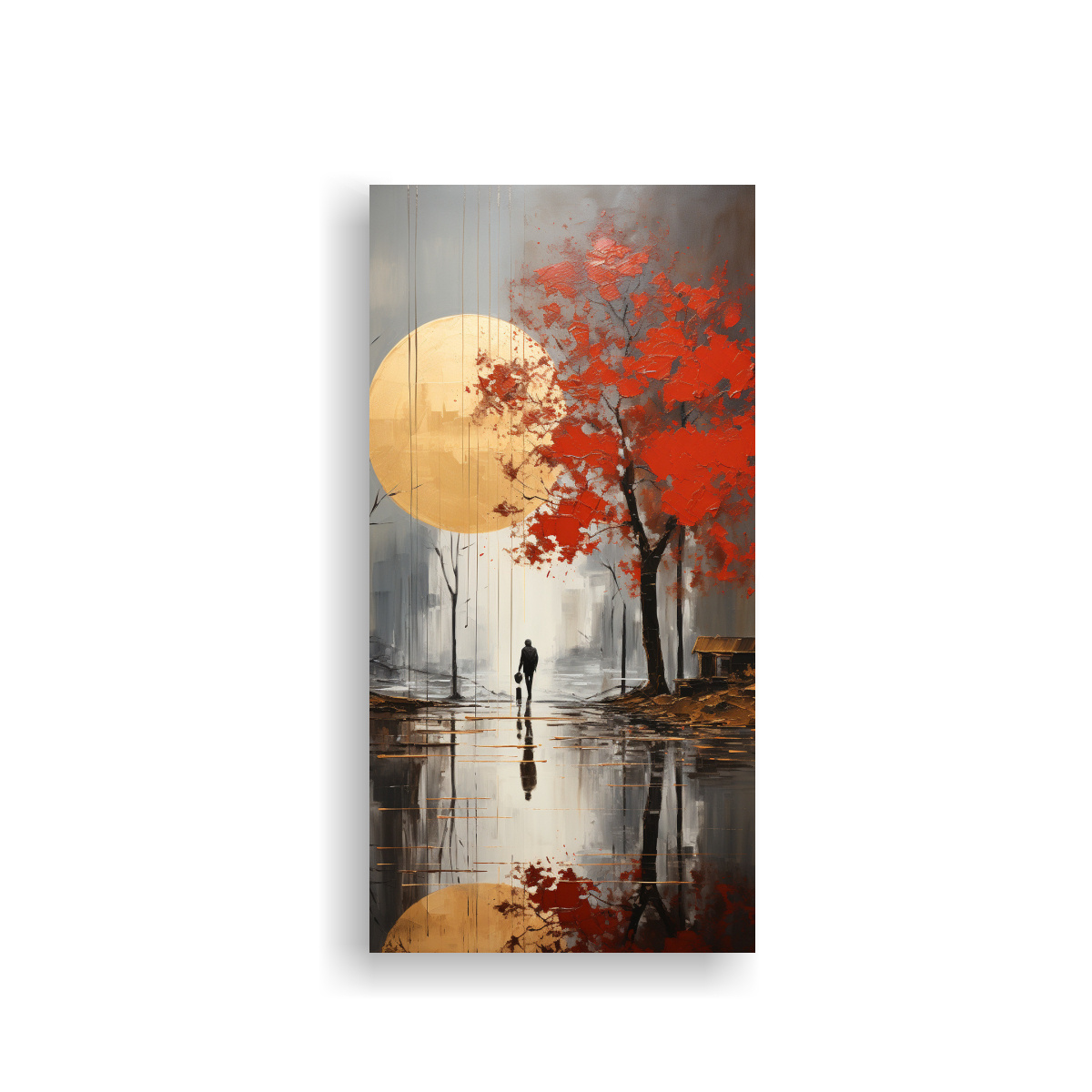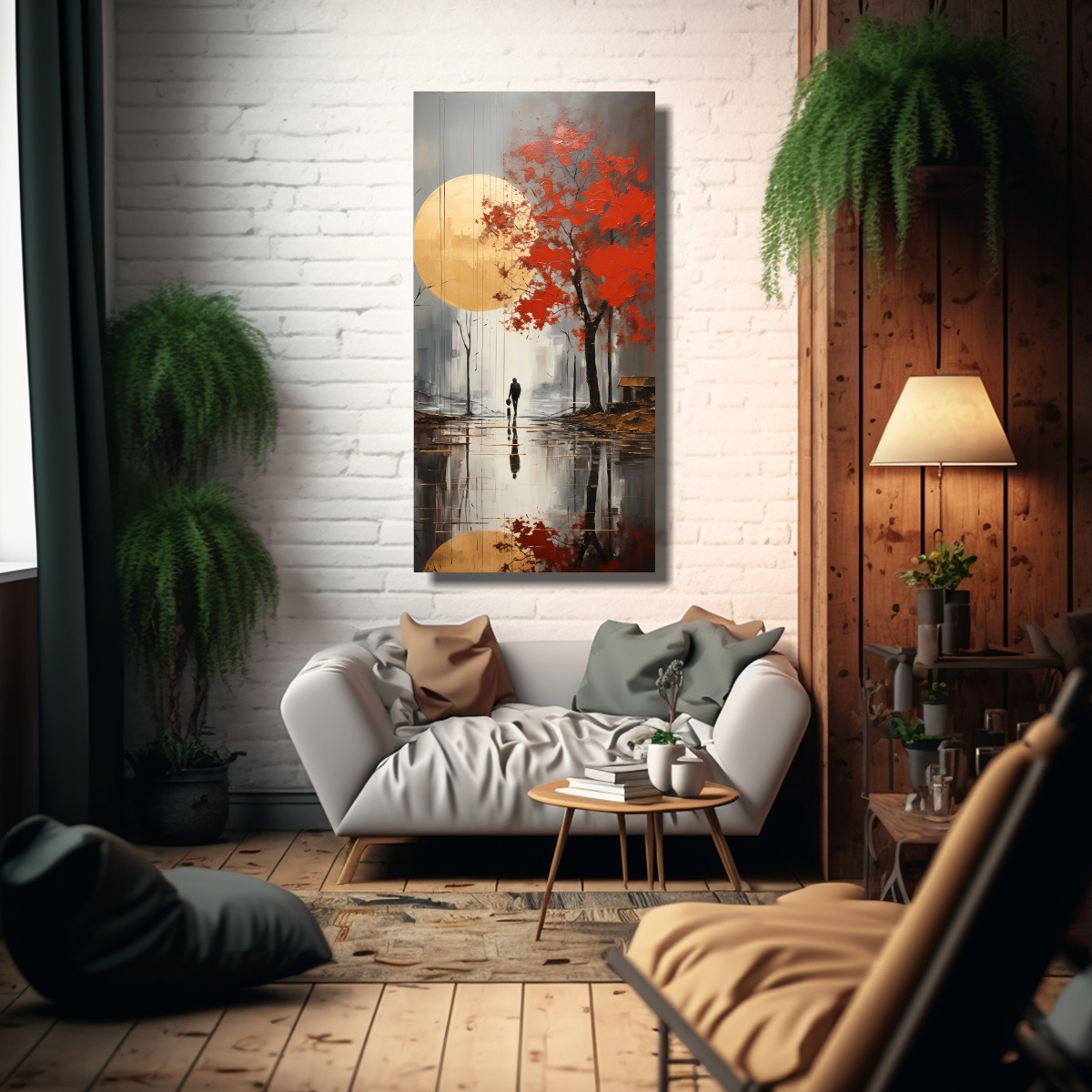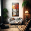 Coloca este cuadro en el centro de tu sala de estar, sobre un sofá de color gris claro Complementa la decoración con cojines en tonos plateados y dorados para resaltar los colores del cuadro Agrega una alfombra beige y cortinas en tonos grises para darle un toque elegante y sofisticado al ambiente ¡Estoy seguro de que este cuadro será el centro de atención y añadirá un toque artístico a tu hogar!