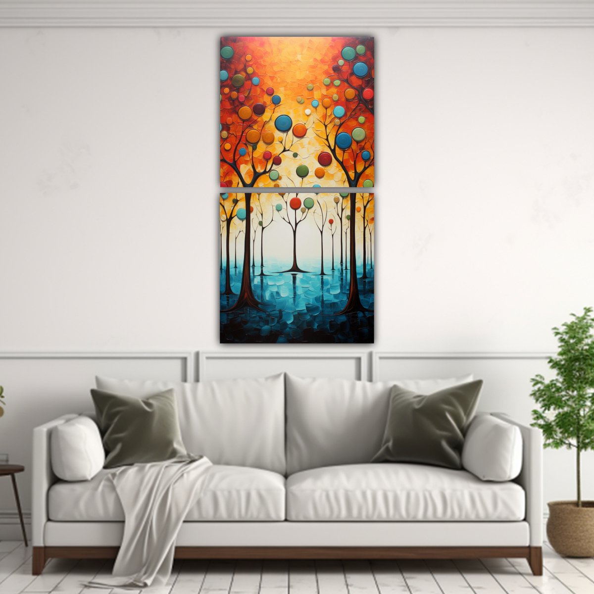 Este cuadro es perfecto para decorar tu sala de estar o tu dormitorio Su diseño abstracto de árboles le dará a tu espacio un toque moderno y sofisticado Puedes colocarlo sobre un sofá o una cómoda para crear un punto focal impactante Combínalo con cojines en tonos dorados y plateados para resaltar los colores del cuadro También puedes agregar plantas en macetas de cerámica en tonos verdes y amarillos para complementar la temática de los árboles ¡Transforma tu hogar con este hermoso diptico de nuestra tienda DecoCuadros!