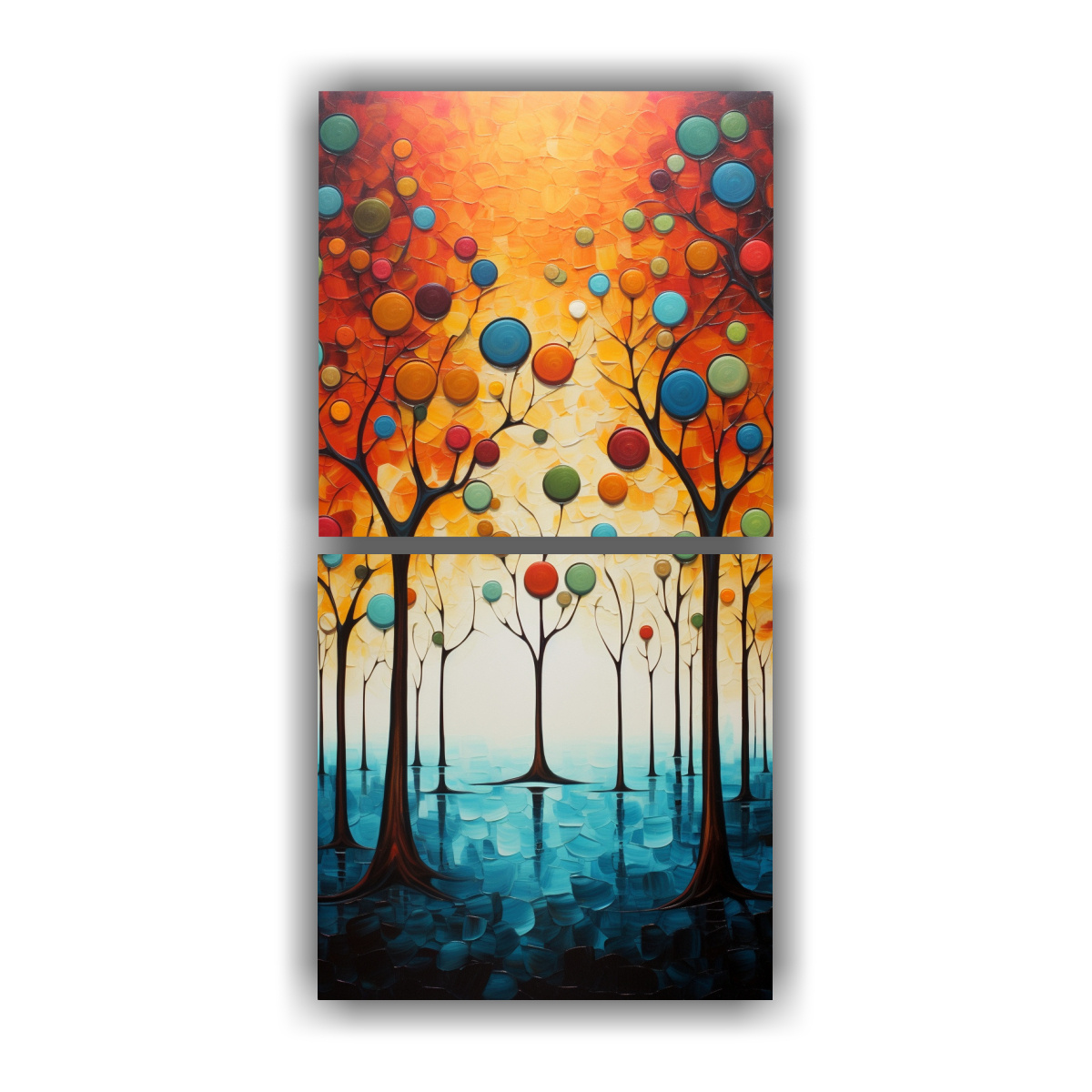 Pintura abstracta de árboles para decorar el hogar con estilo y elegancia Colores: Carmesi, Coral, Azul Marino grisaceo, Plateado, Menta, Dorado, Verde Azulado, Amarillo Claro