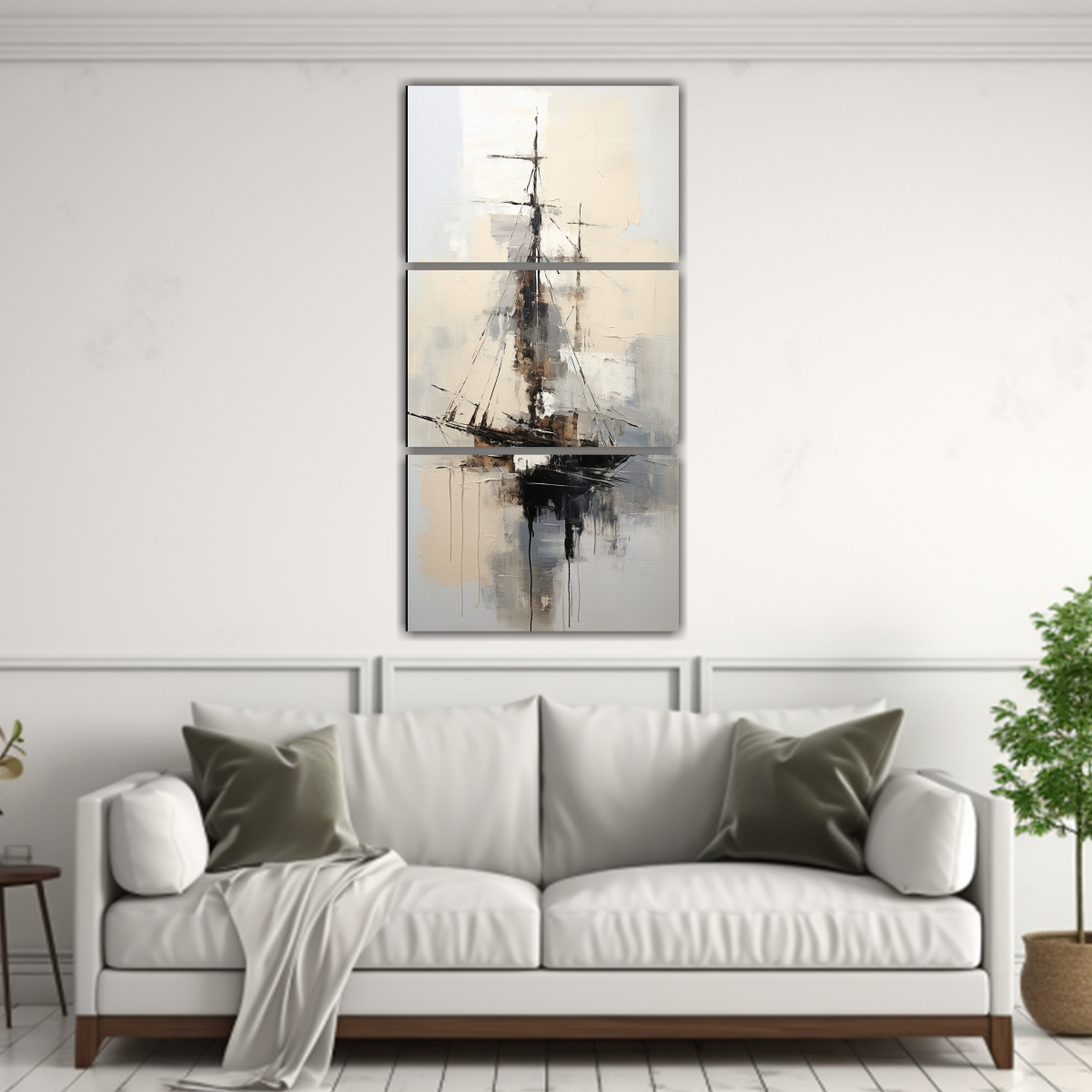 Este set de 3 lienzos de tela con una pintura abstracta de barco en blanco y negro es perfecto para decorar tu sala de estar, comedor o dormitorio Puedes colocarlos juntos como un tríptico en una pared vacía para crear un punto focal impresionante También puedes distribuirlos de forma asimétrica en diferentes paredes para darle un toque de modernidad a tu espacio Combínalos con muebles de colores neutros como beige o gris para resaltar el contraste y crear una atmósfera elegante y sofisticada