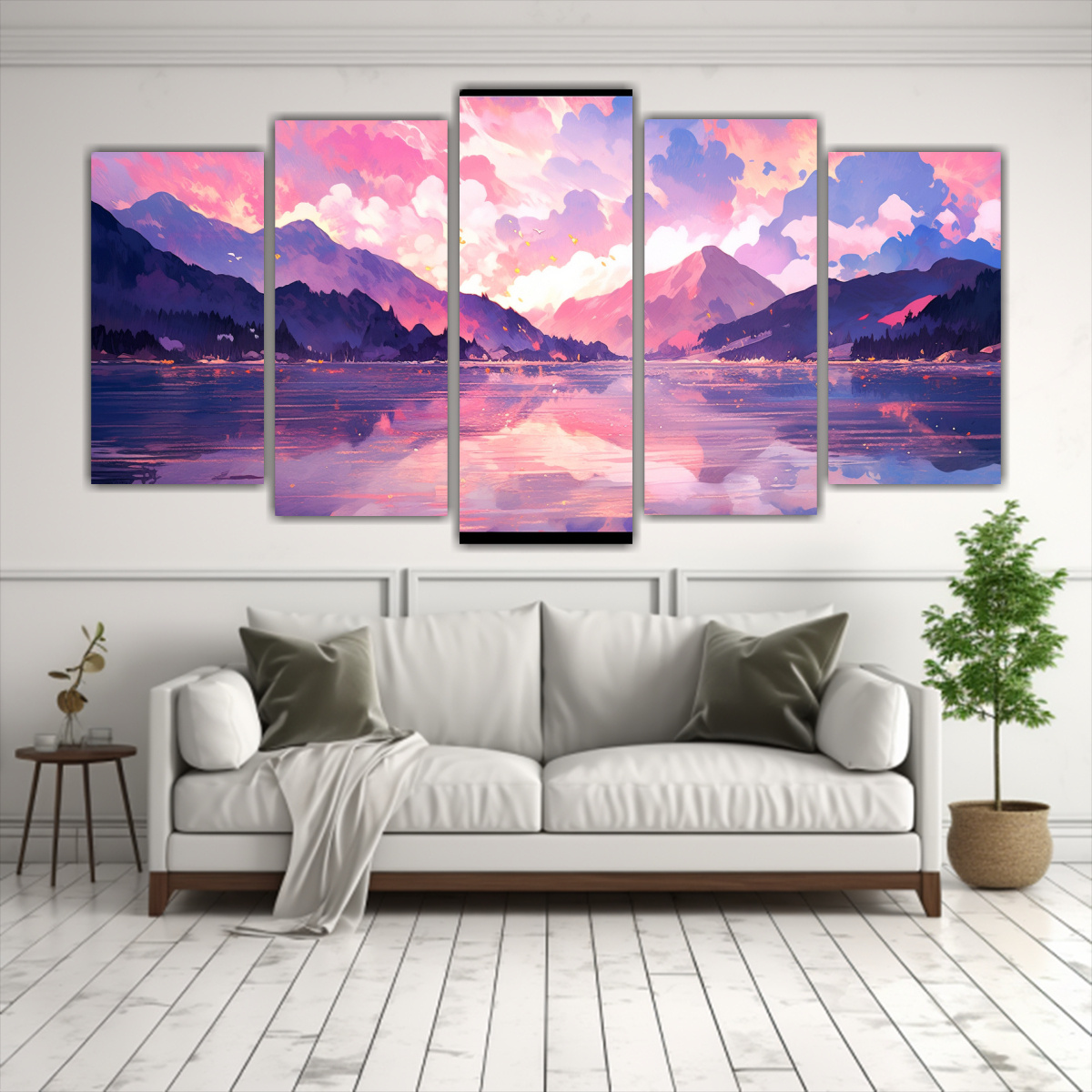 Renueva tu hogar con este cuadro abstracto inspirado en un lago de montañas con tonos rosados y otros colores vibrantes DecoCuadros ofrece diseños exclusivos y entregas rápidas en Santiago, con envíos express a regiones