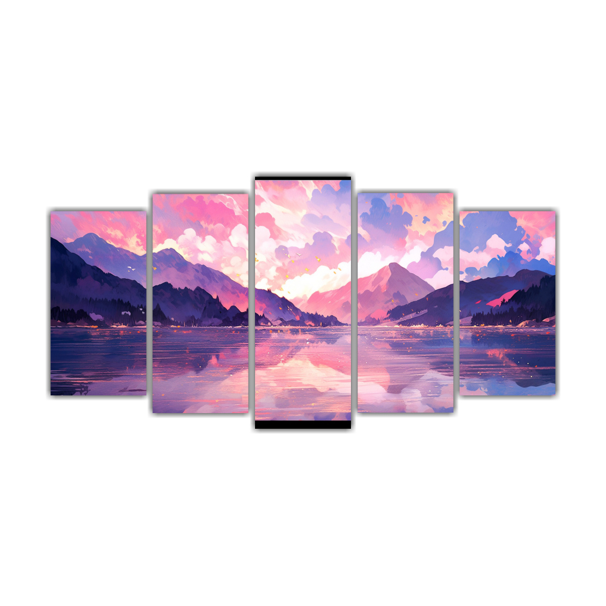 Pintura Abstracta De Cinco Movimiento Fantastico En Un Lago De Montañas Con Colores Rosados
