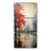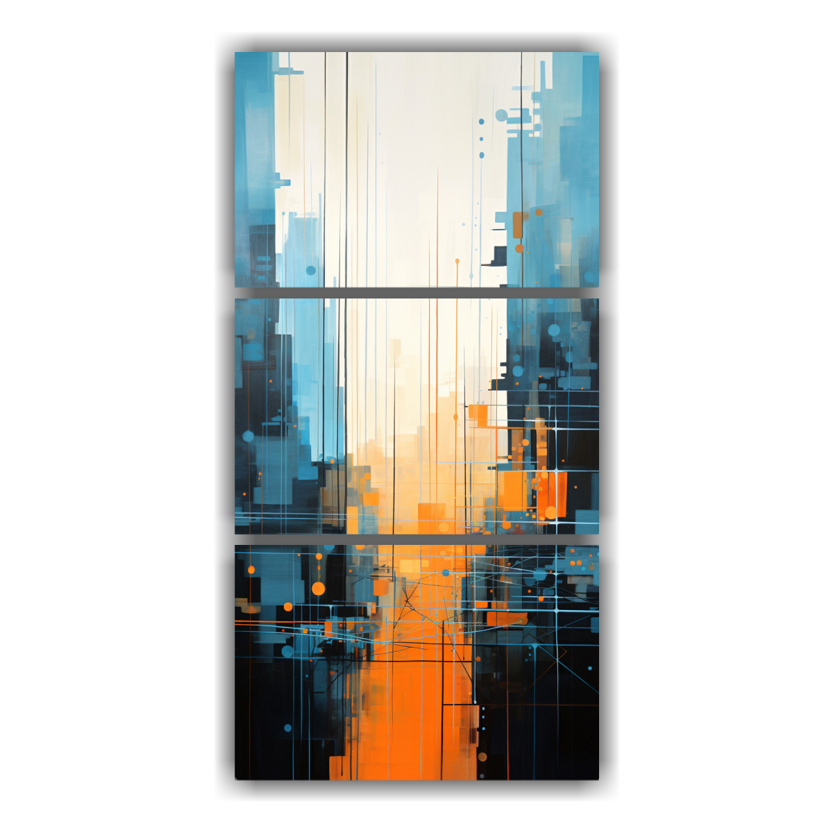 DecoCuadros te presenta una pintura abstracta de ciudad en tonos azules y naranjas, con colores que van desde el azul marino grisaceo hasta el coral Nuestros cuadros están impresos en tela de alta calidad y cuentan con bastidores de madera, lo que les da una apariencia elegante y duradera