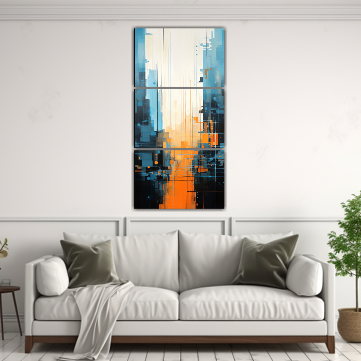 Este cuadro se vería increíble en una sala de estar moderna con tonos neutros como beige y gris Puedes colocarlo sobre un sofá de color claro para que resalte y combine perfectamente con los demás elementos decorativos ¡Agrega un toque de estilo a tu hogar con nuestra pintura abstracta de ciudad en azul y naranja!