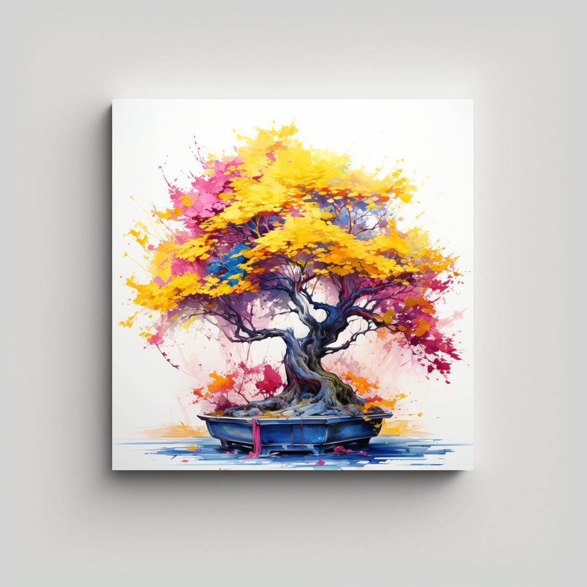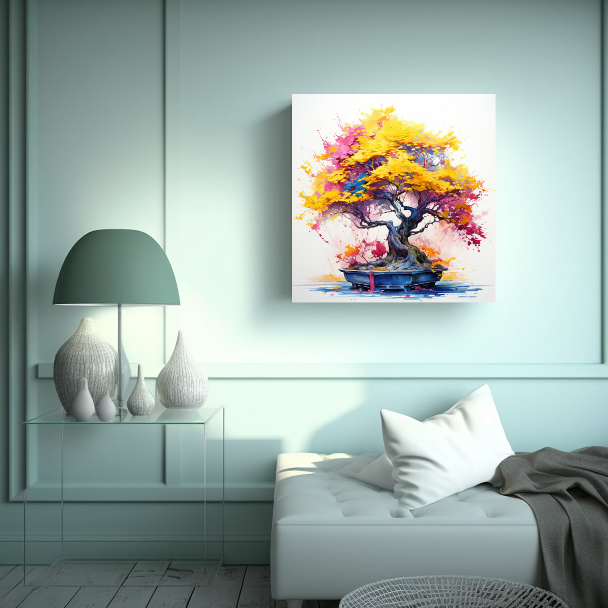 La pintura abstracta de colores amarillo y azul con composición impresa de simetría a fuchsia Bonsai de DecoCuadros es una opción ideal para darle vida y color a tus espacios Con tonos como el azul marino grisáceo, el carmesí, el dorado y el amarillo claro, este cuadro combina con una amplia gama de estilos de decoración