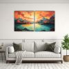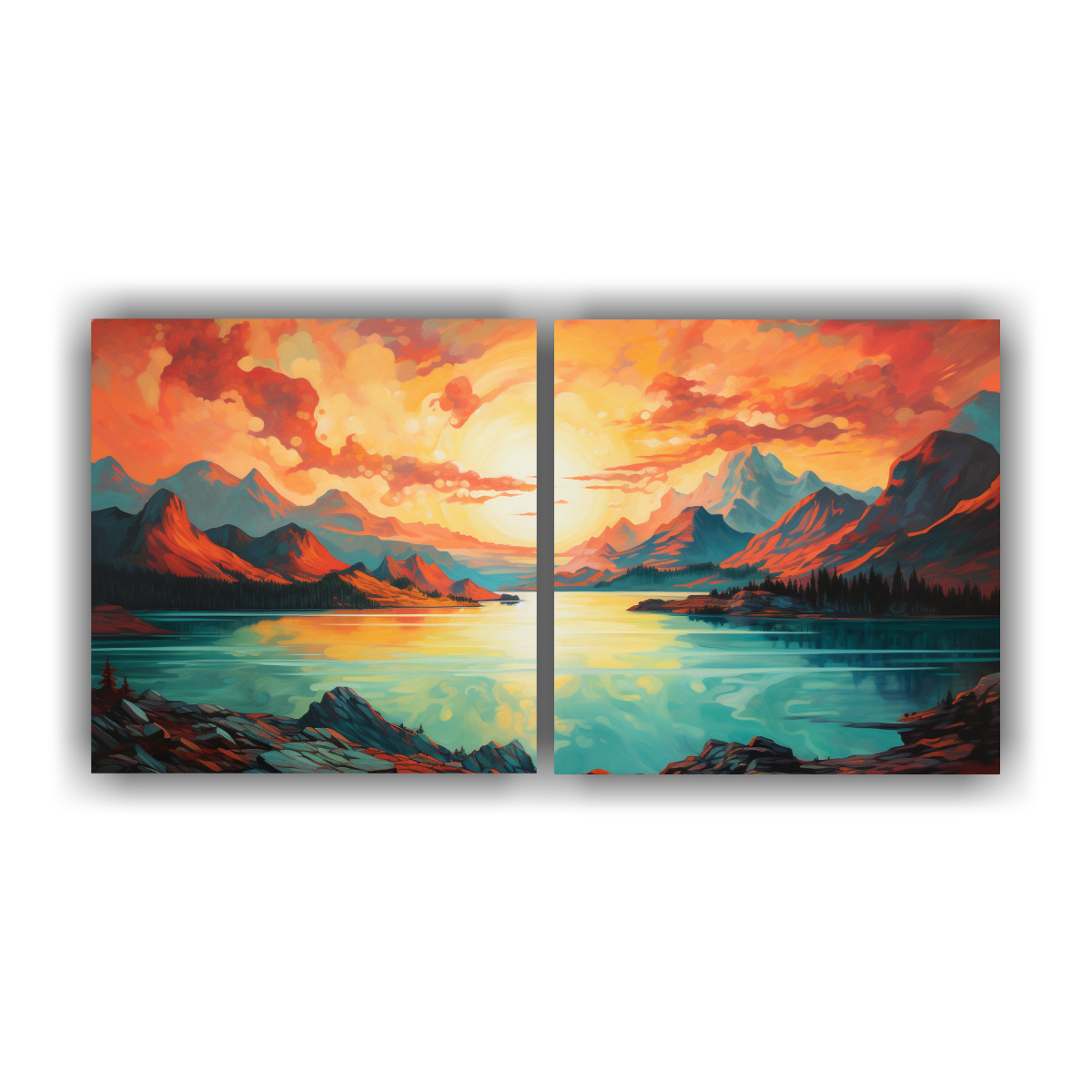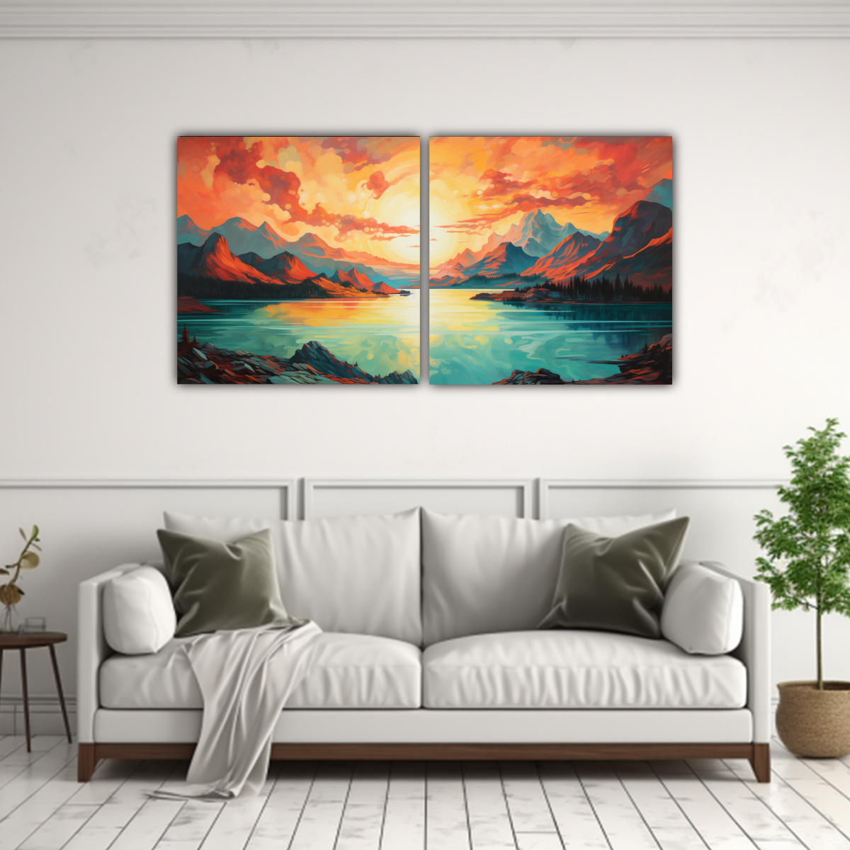 Pintura Abstracta De Colores Naranjas En Montañas Junto Al Lago