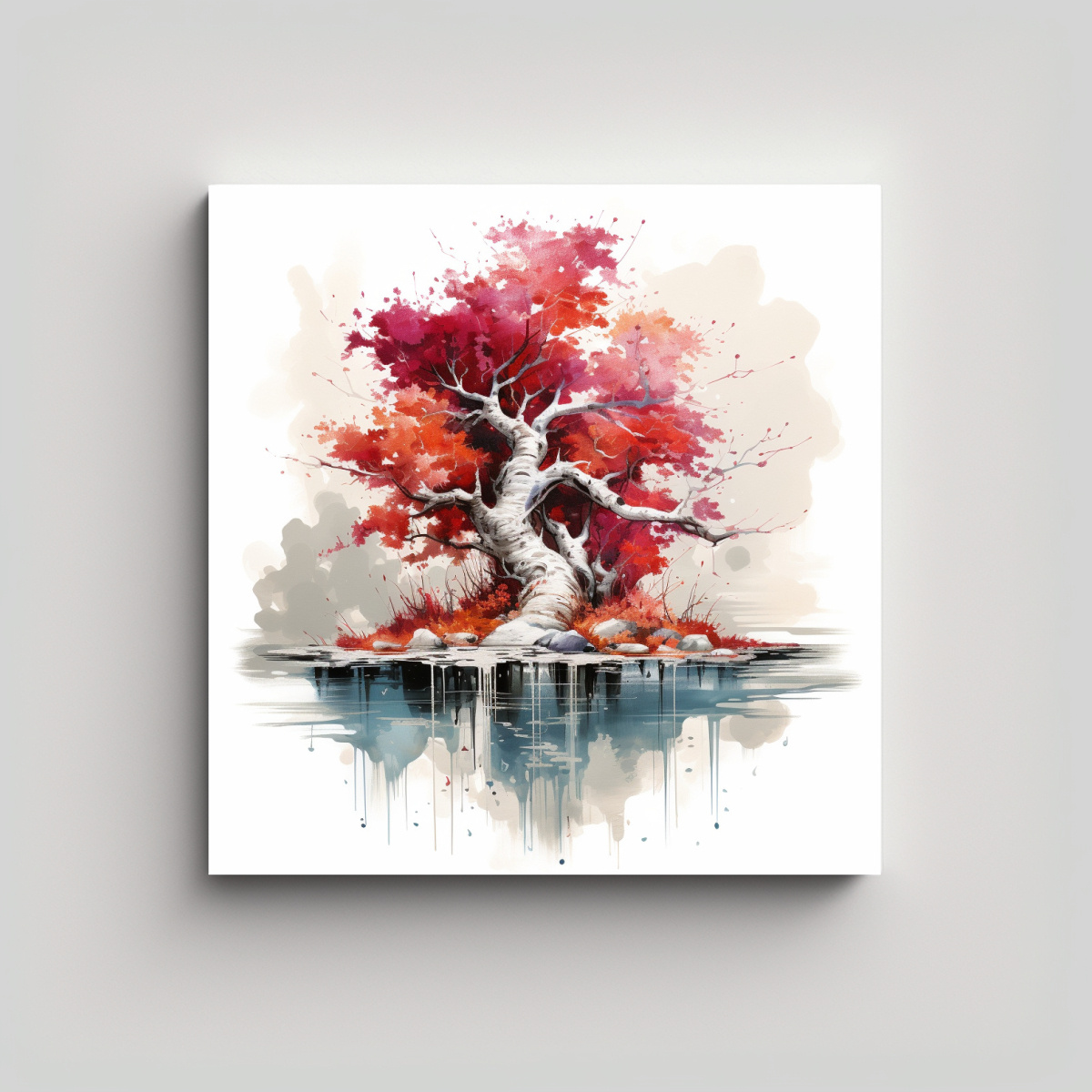 Pintura Abstracta De Colores Rojos En Acuarela, árbol De Bonsái De Abedul Duradero