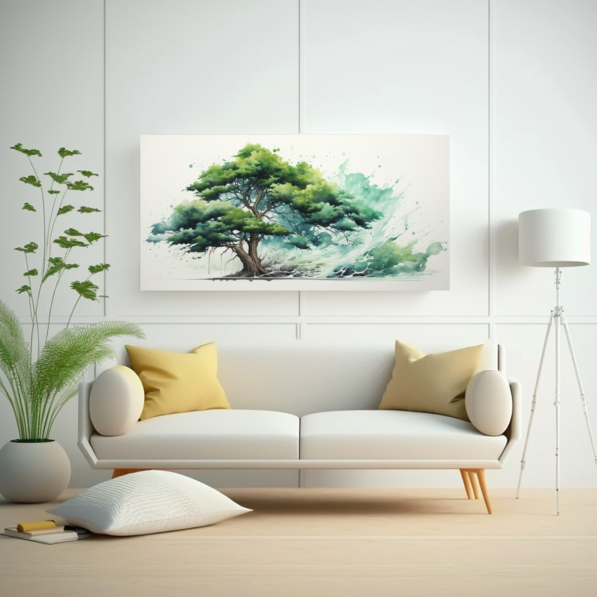 Pintura Abstracta De Colores Verde Y Turquesa En Habitación Con árbol De Cedro