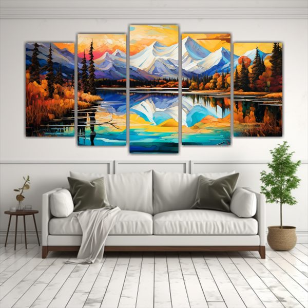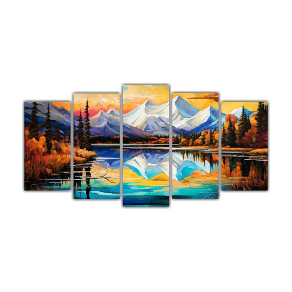 Pintura Abstracta De Colores Vivos En Lienzo De Cinco Expresión En Un Paisaje De Lagos Y Montañas.