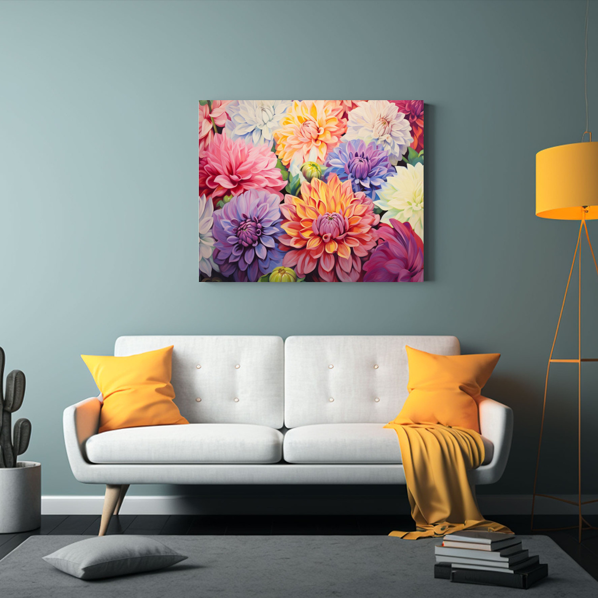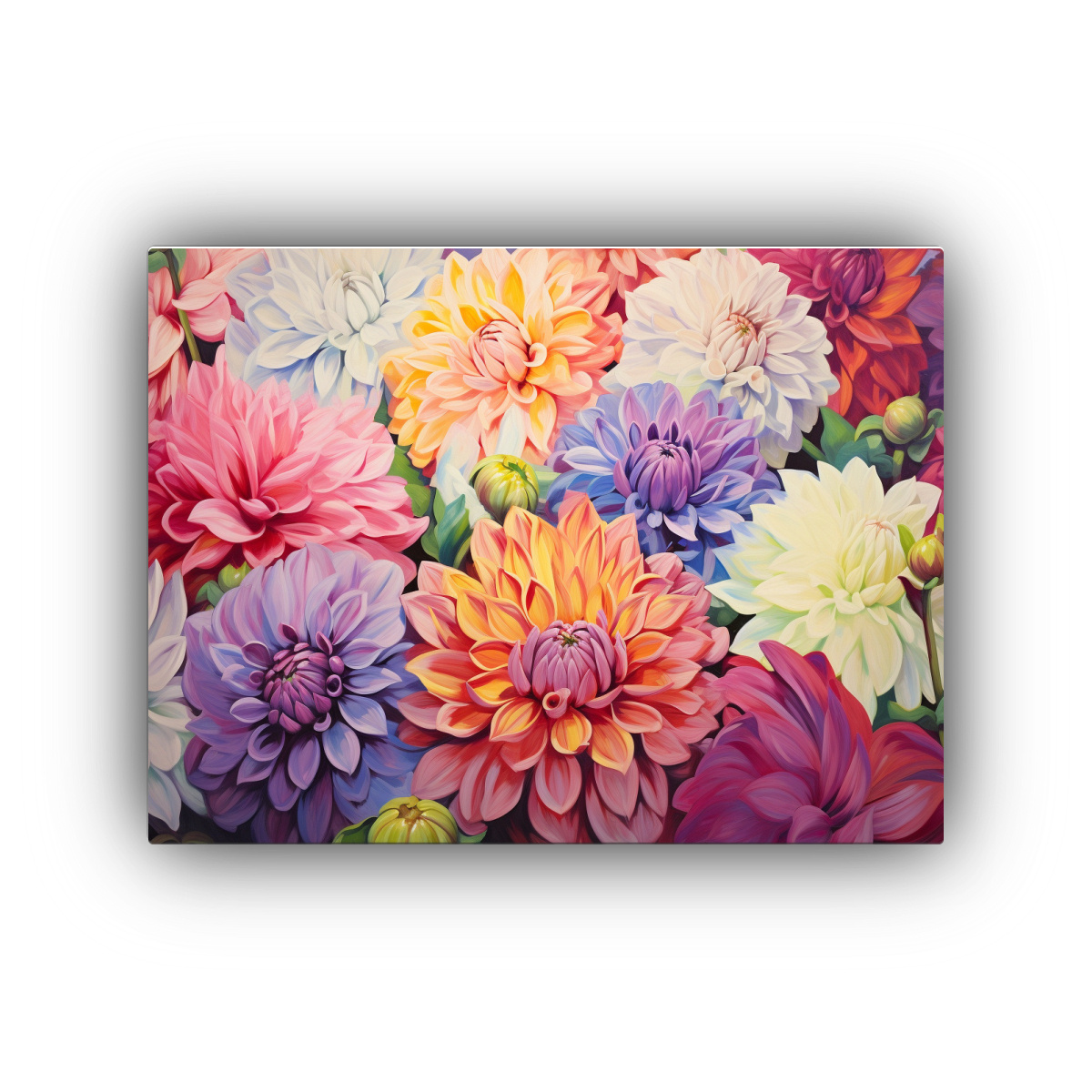 Este cuadro abstracto de dalias vintage encajaría perfectamente en un salón elegante o en un dormitorio con tonos neutros Colóquelo sobre un mueble blanco para resaltar sus colores vibrantes y añadir un toque de sofisticación a la habitación