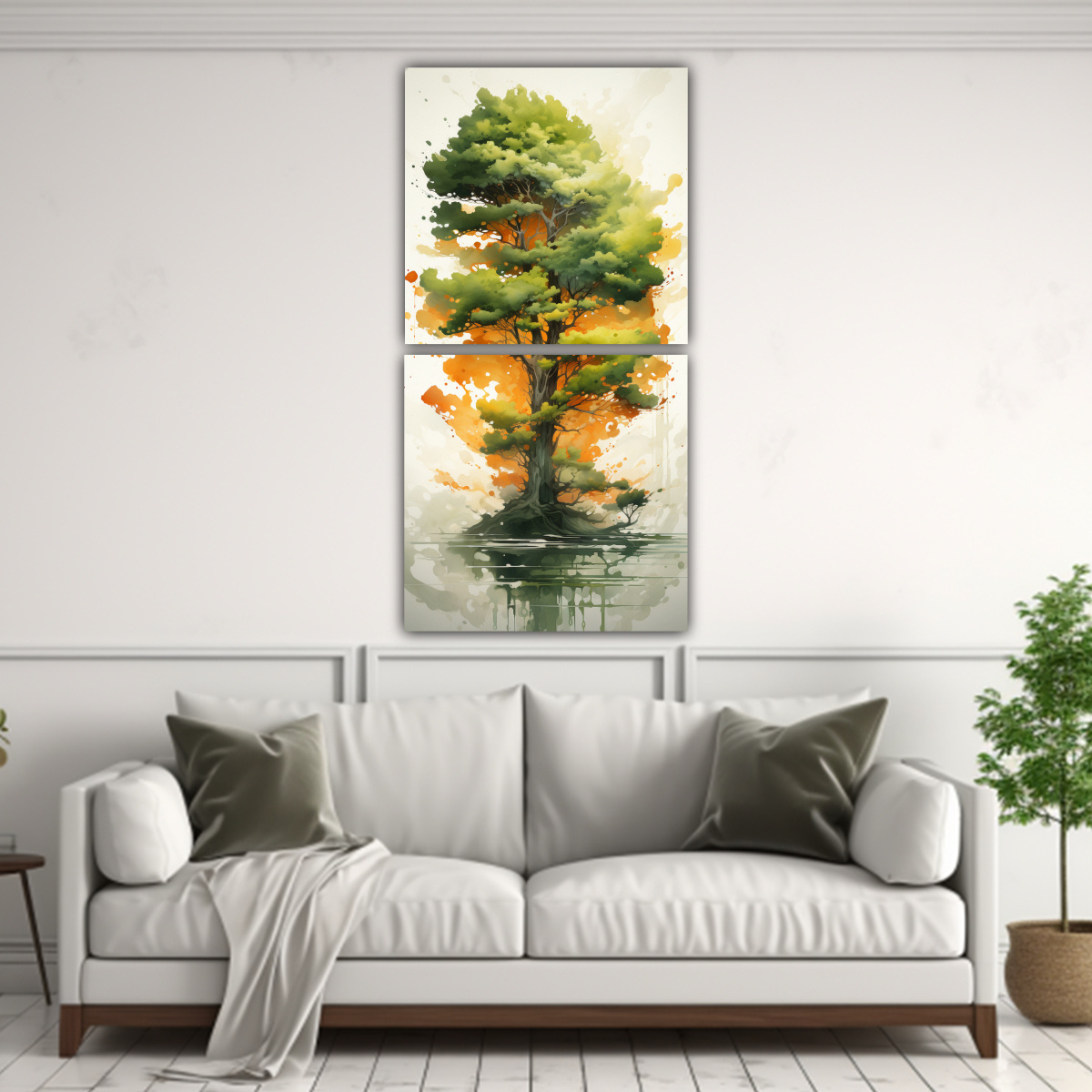 Pintura Abstracta De Dos Telas En Bastidor Resistente Diseño En Color Verde De árbol De Ciprés Y Dorado