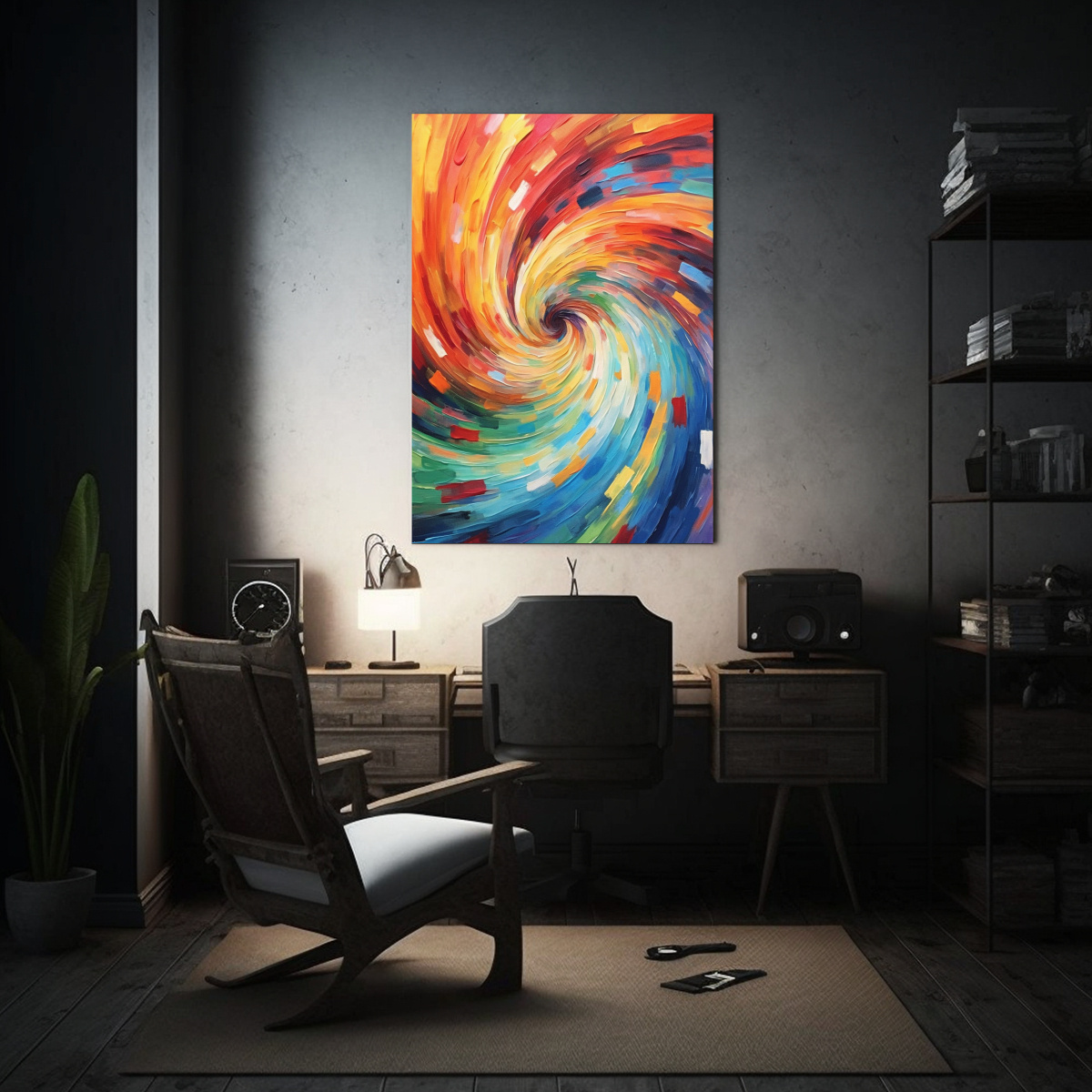 Este cuadro de pintura abstracta de espiral con remolinos coloridos sería perfecto para decorar una sala de estar moderna Colócalo sobre un sofá gris o blanco para realzar los tonos vibrantes de la pintura Combínalo con cojines en los mismos colores para crear una armonía visual en la habitación También puedes agregar algunas plantas de interior para aportar frescura y equilibrio al espacio ¡Con este cuadro, tu sala de estar se verá elegante y con un toque de creatividad!