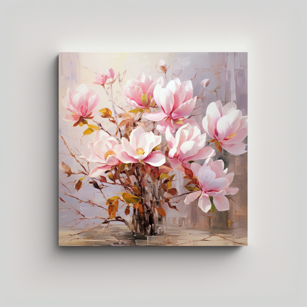 Esta pintura abstracta de flores magnolias en estilo Estilo óleo se vería impresionante en un dormitorio o sala de estar con una decoración moderna Colóquelo sobre un sofá o una cama para crear un punto focal llamativo Complemente los tonos lila, azul y gris con cojines y accesorios en esos mismos colores para lograr una armonía visual ¡Será el centro de atención en cualquier espacio!