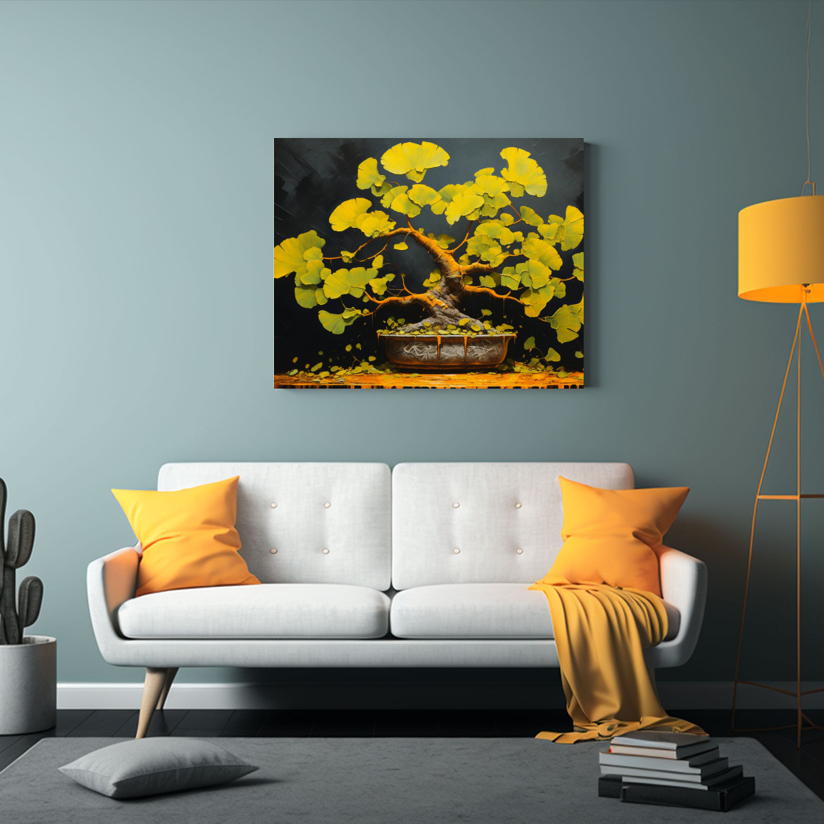 Este cuadro abstracto de Ginkgo Biloba en bonsái se verá espectacular en un ambiente moderno y elegante Colócalo en la sala de estar sobre un mueble blanco para resaltar sus colores o en la oficina para dar un toque artístico y sofisticado
