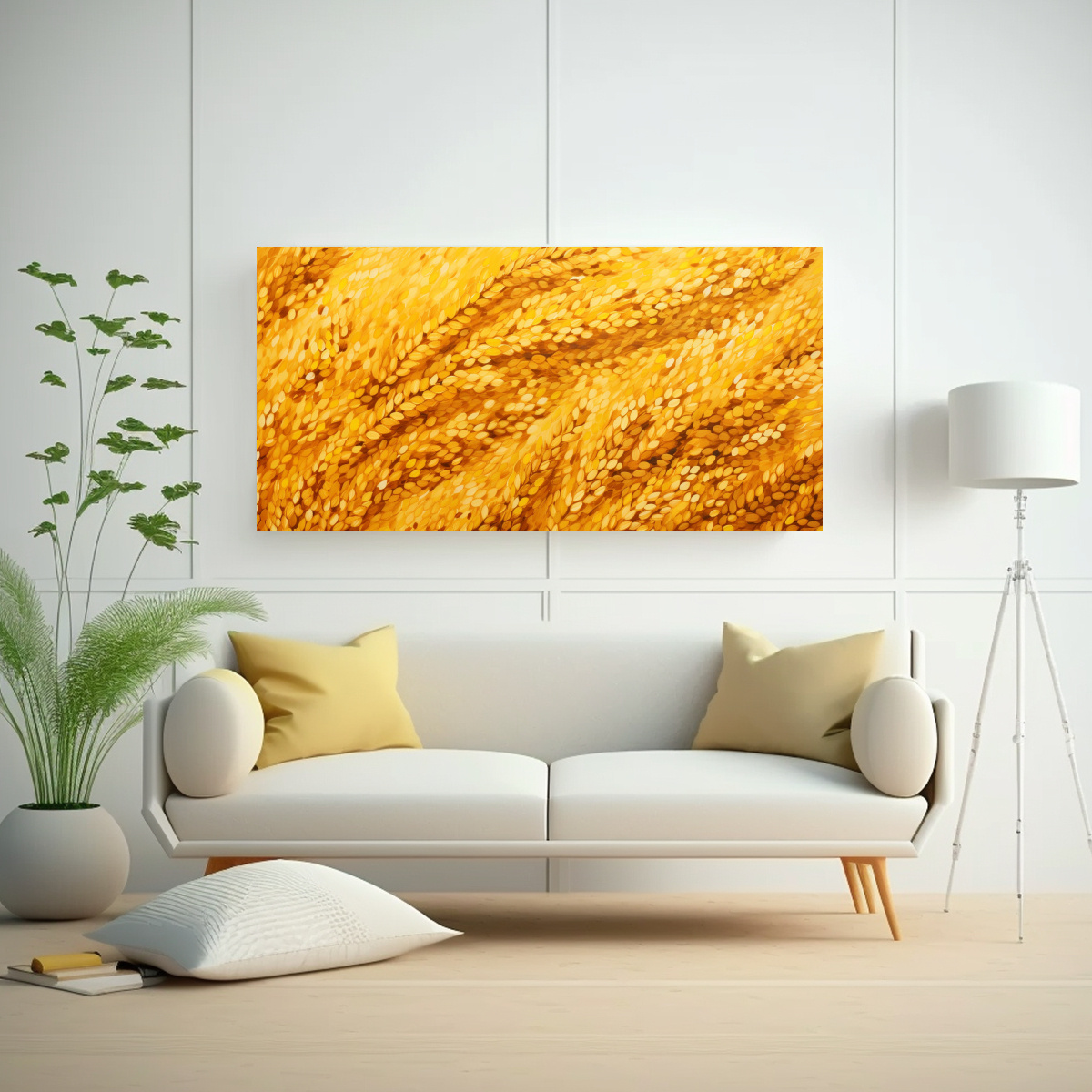Coloca este cuadro en tu sala de estar para crear un ambiente moderno y sofisticado Combínalo con muebles en tonos neutros para resaltar sus colores cálidos, y añade cojines en amarillo o mostaza para una armonía visual ¡Haz de tu sala un espacio único con esta obra de arte!
