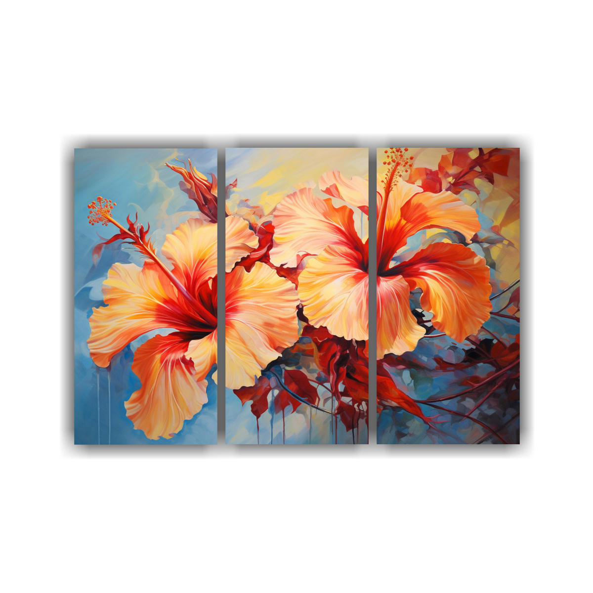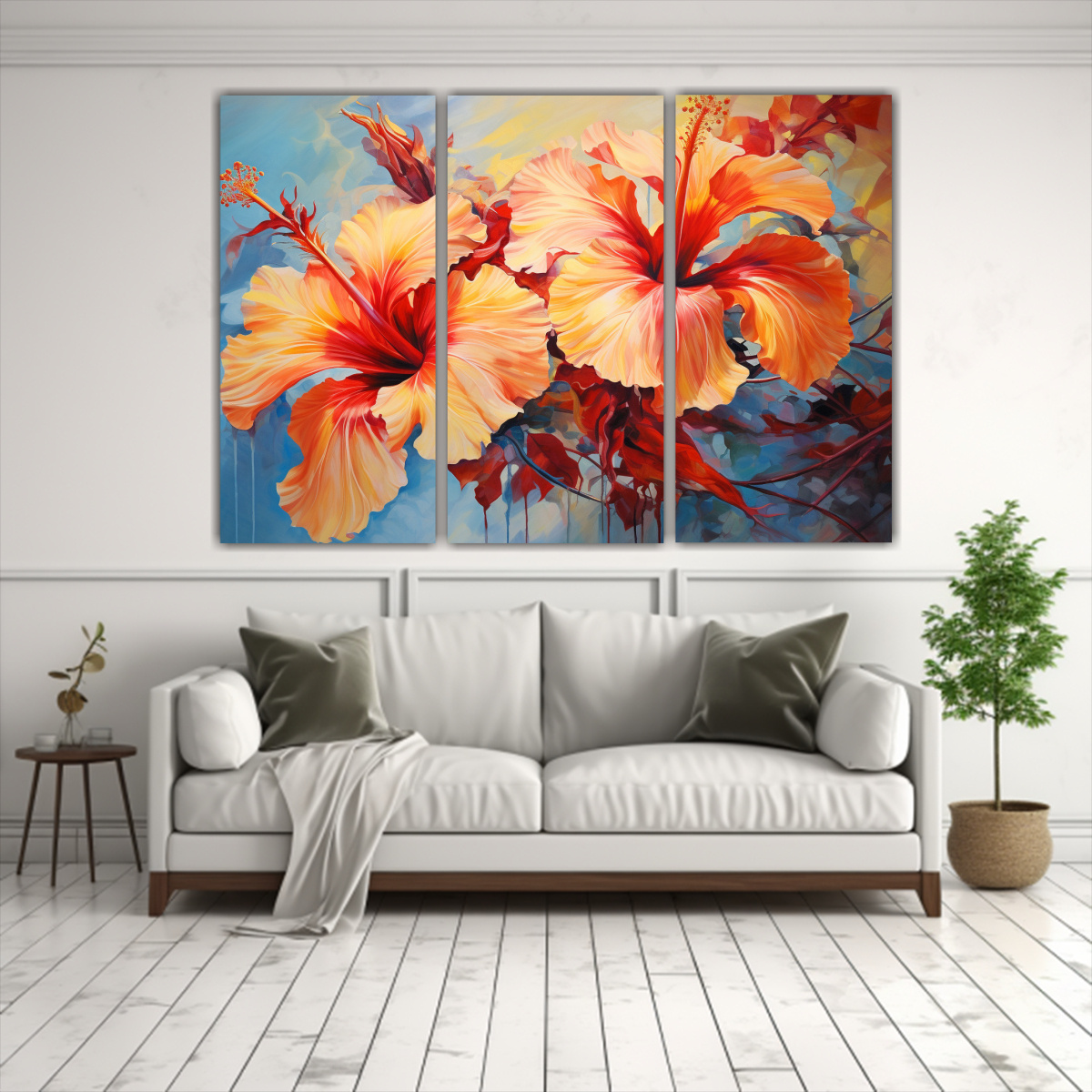 Este cuadro abstracto de hibiscos en movimiento sería ideal para colocar en el living, creando un punto focal que combine con muebles de tonos neutros y accesorios en colores como coral y turquesa Aportará un toque de elegancia y frescura a tu hogar