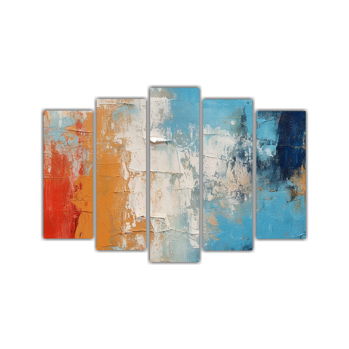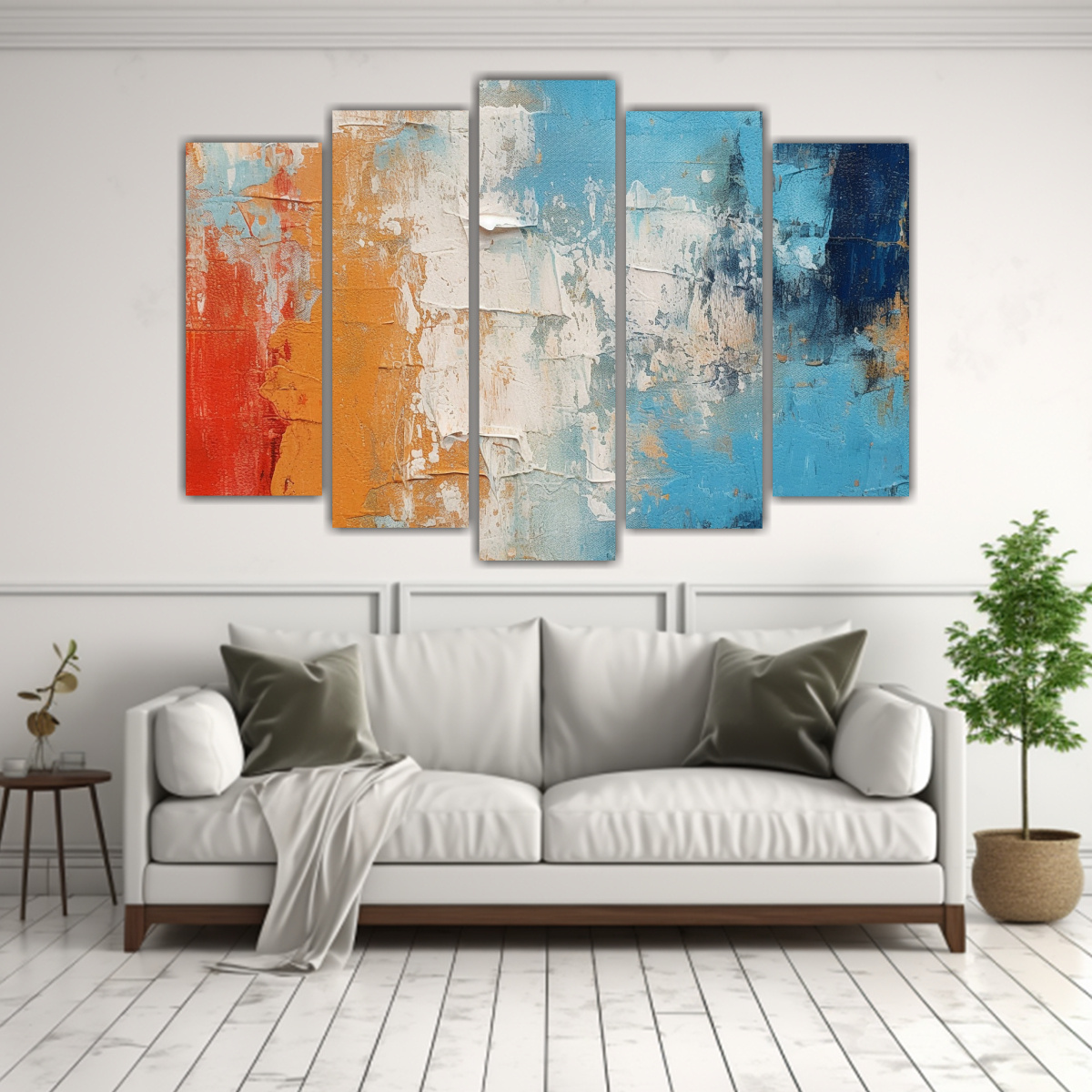 DecoCuadros presenta una pintura abstracta de lienzos acuarela luminosa en rojo, naranja y azul Destaca con colores como plateado, carmesí y azul marino grisáceo Diseños exclusivos para un ambiente moderno y armonioso