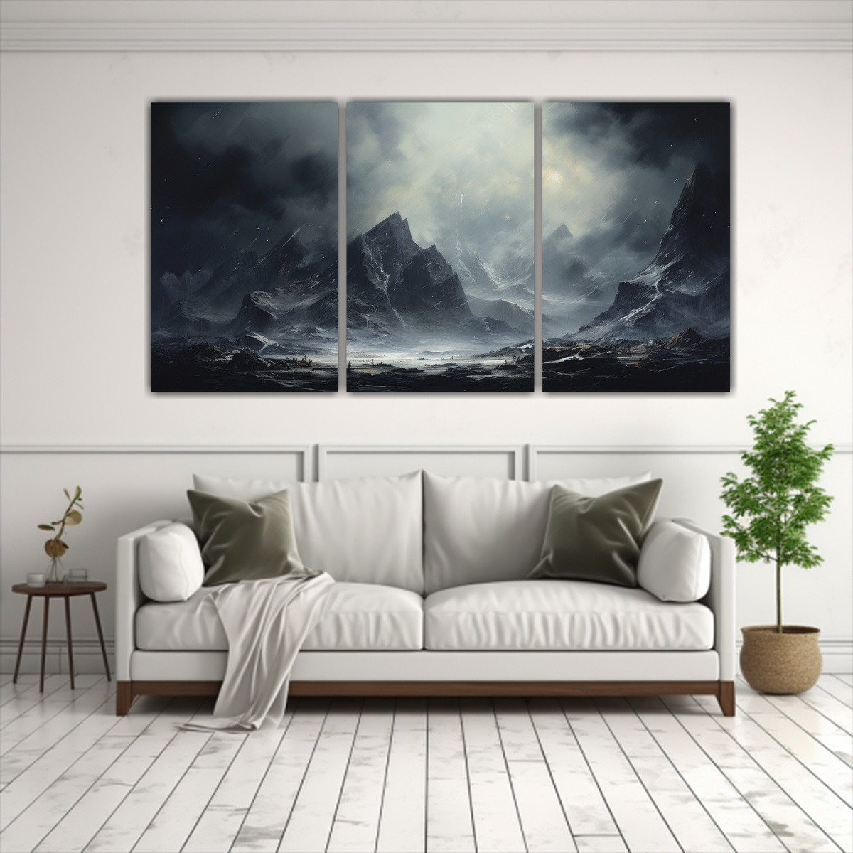 Añade un toque elegante a tu sala de estar o dormitorio con esta impresionante pintura abstracta de lindas montañas nevadas Los colores oscuros como Azul Marino grisaceo y Gris le darán un aire sofisticado a tu espacio