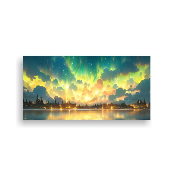 Este cuadro abstracto de luces del norte con colores amarillos es perfecto para destacar en una sala de estar moderna Colócalo sobre un sofá gris para crear un contraste elegante o en una pared beige para aportar calidez ¡Combina con cojines en tonos plateados y mostaza para un look sofisticado!