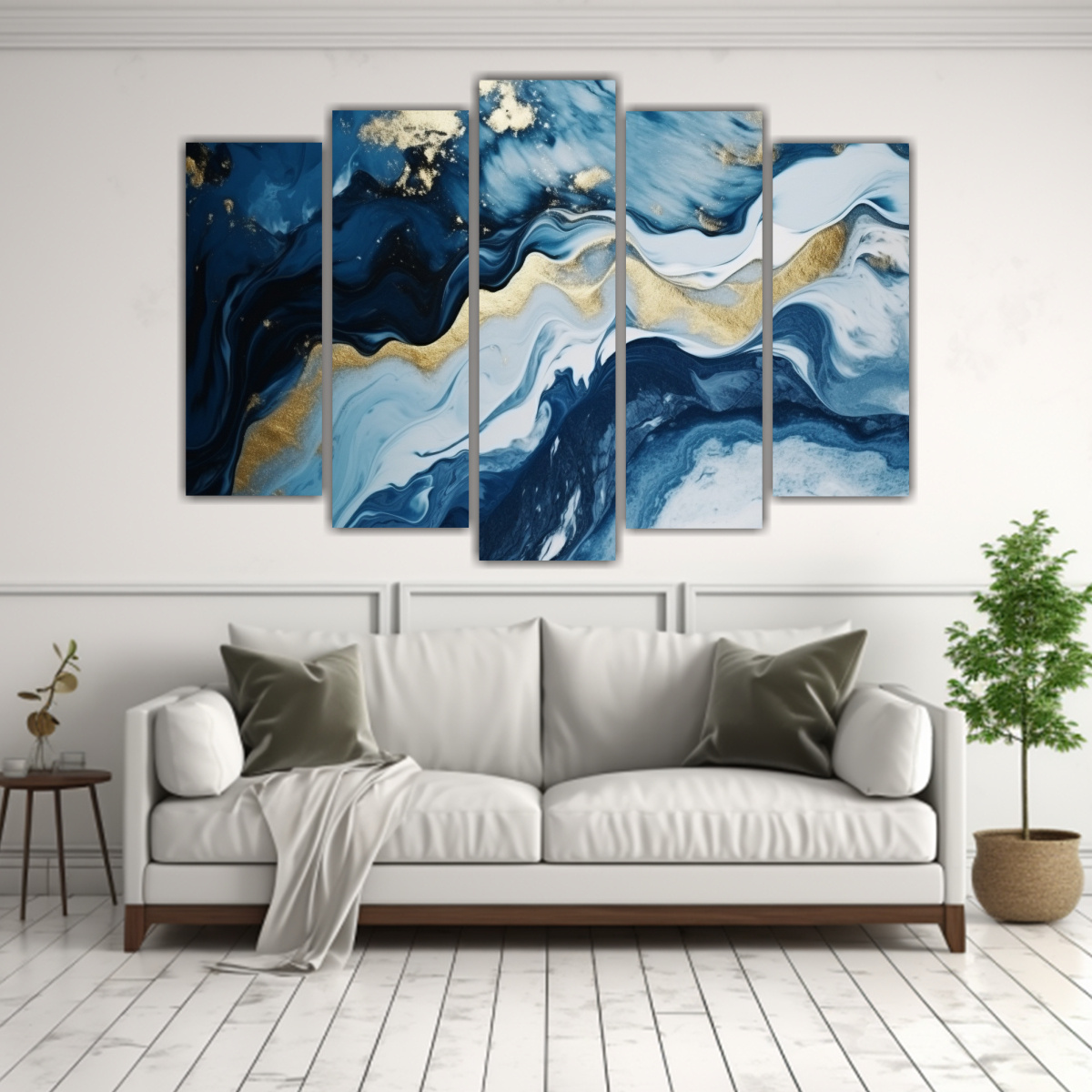 Pintura Abstracta De Mármol Azul De Lujo Con Polvo De Oro.
