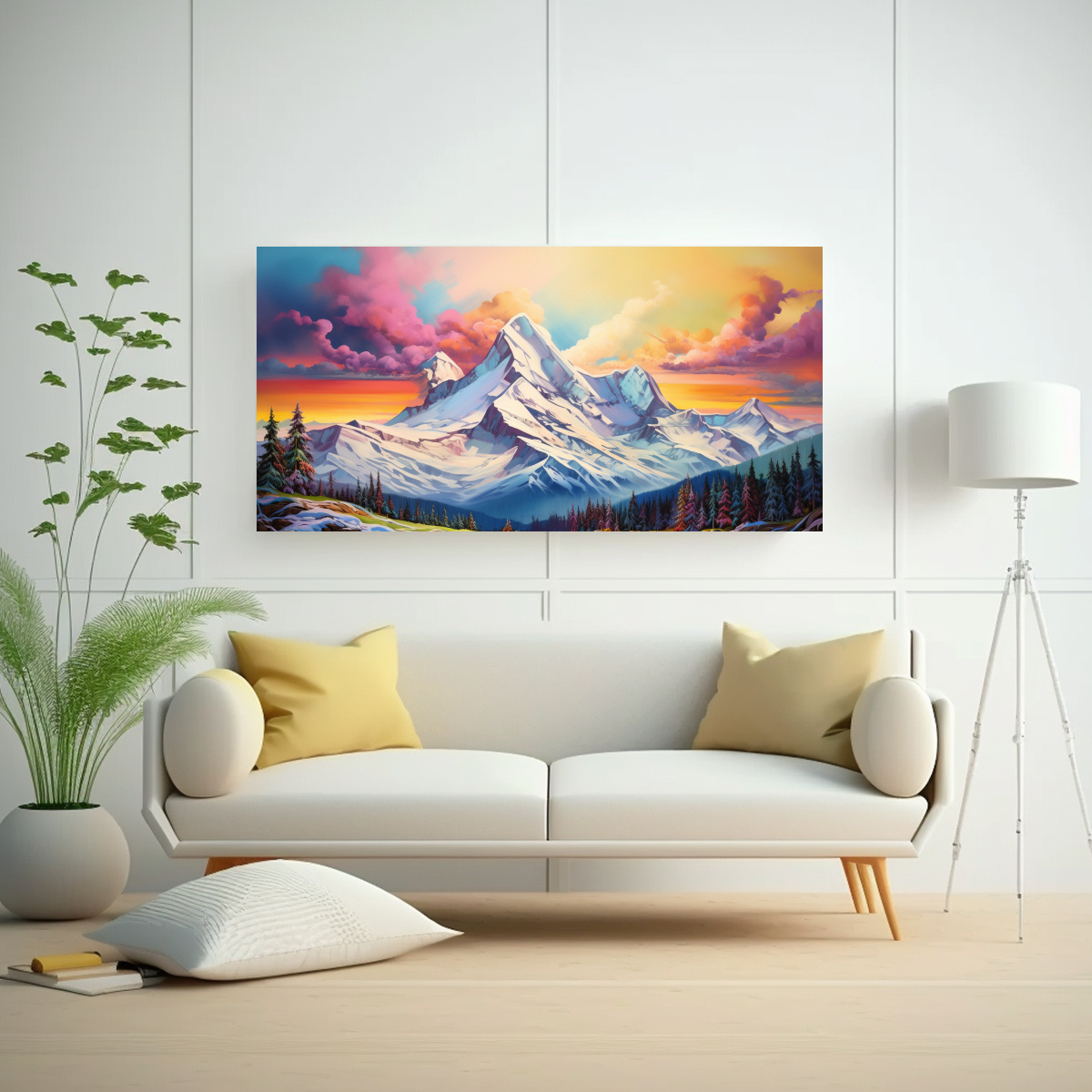 Pintura Abstracta De Montañas Nevadas Con Arcoíris Y Colores Amarillos