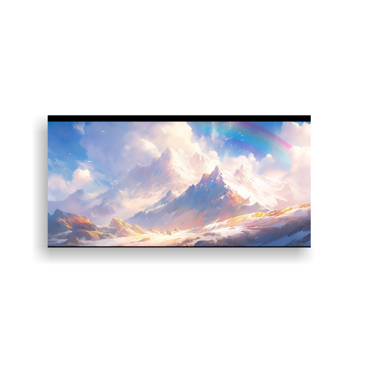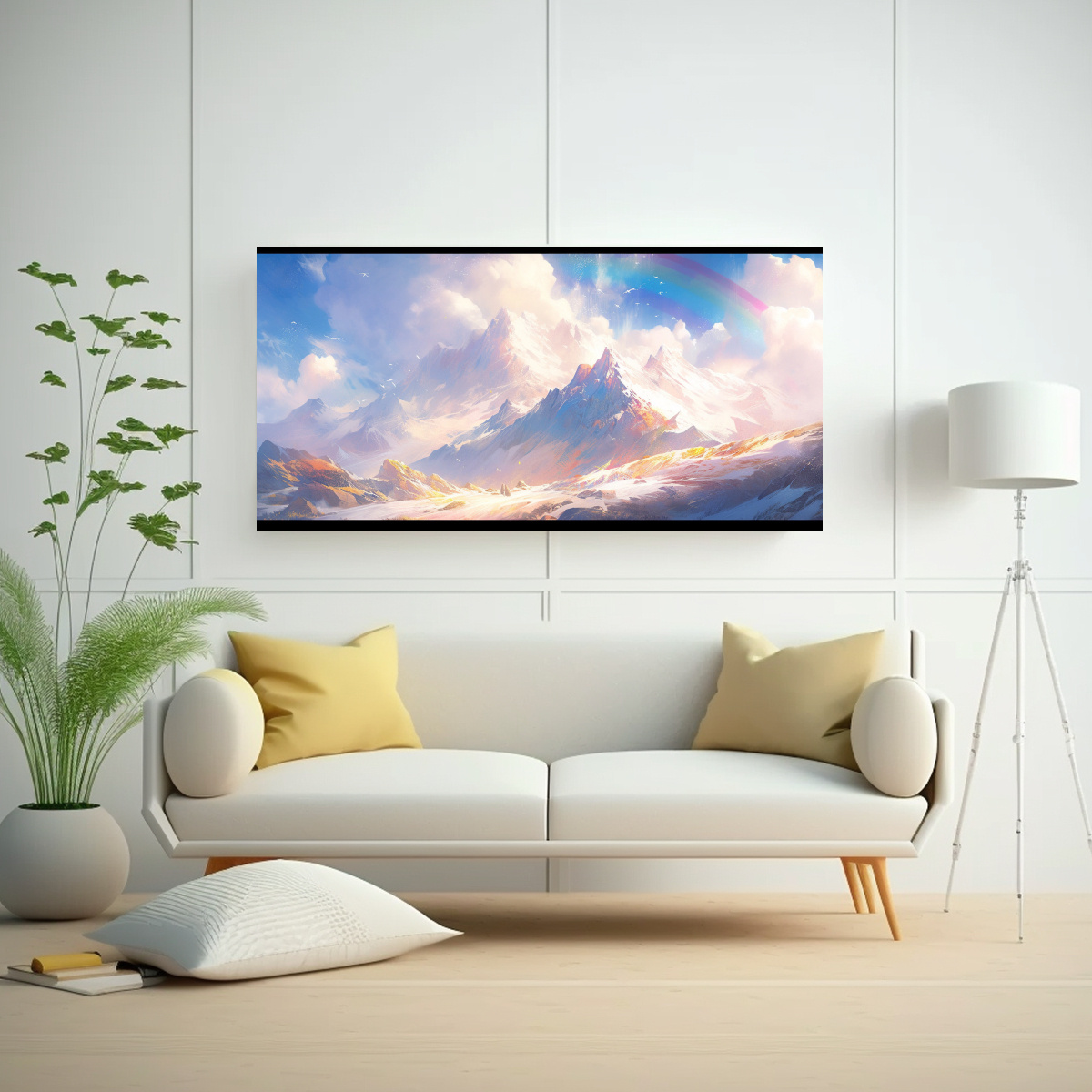 Para realzar la belleza de esta pintura abstracta, te recomendamos colocarla en el centro de una pared blanca o en un espacio con iluminación natural Combínala con muebles de tonos neutros para crear un ambiente armonioso y moderno ¡Logra un efecto visual impactante con este cuadro de montañas nevadas y arcoíris!