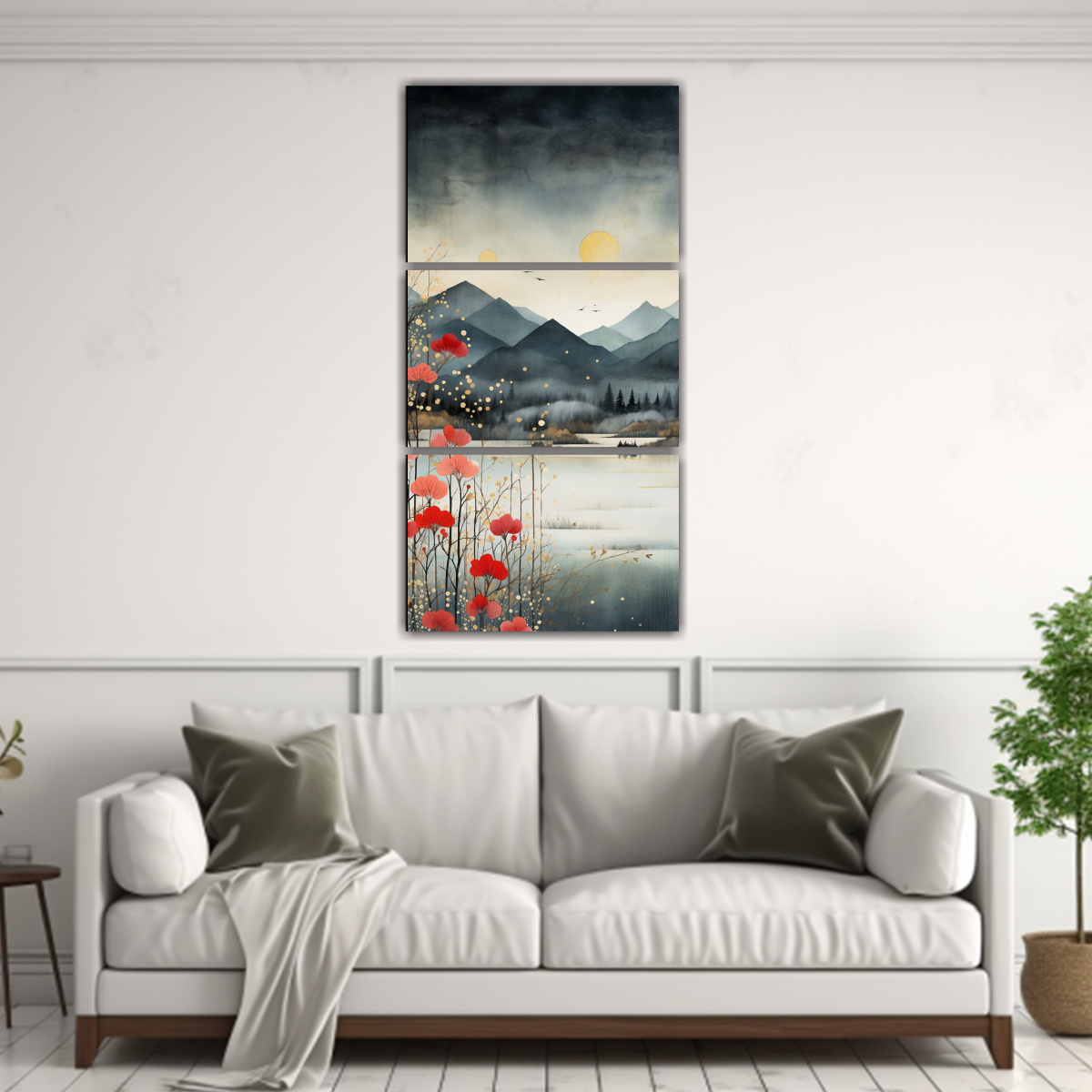Este impresionante cuadro de montañas en tres telas sería ideal para colocar en el área de la sala de estar sobre un sofá de color neutro Combinará perfectamente con una decoración moderna o minimalista, aportando elegancia y un toque de naturaleza a tu ambiente