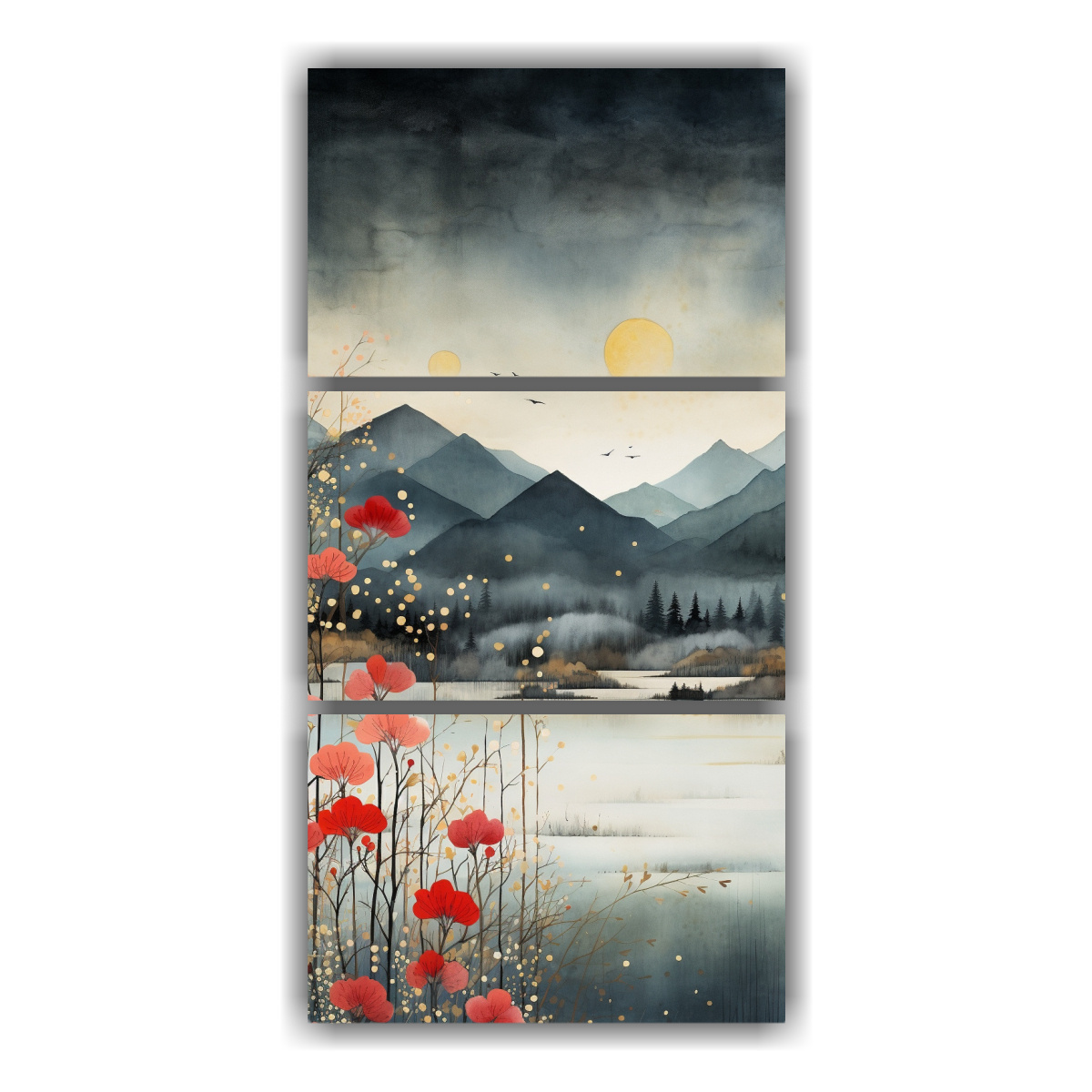 Pintura Abstracta De Montañas Reflejándose En Decoración Con Tres Telas