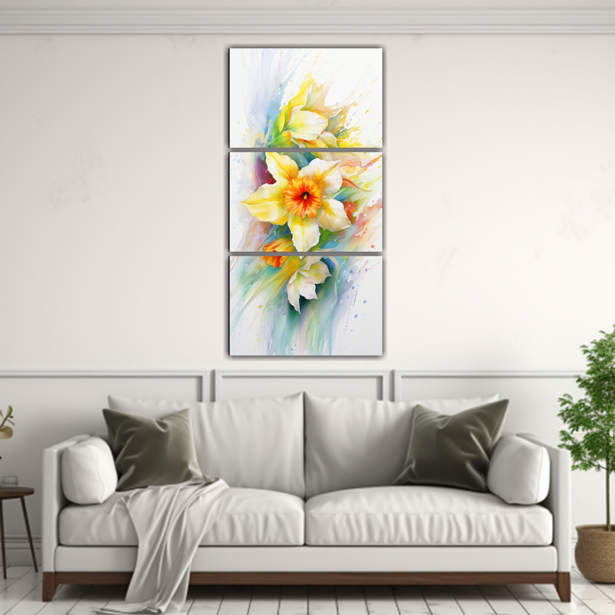 Este cuadro abstracto de narcisos en arco iris en acuarela quedará perfecto en tu sala de estar sobre un sofá blanco o beige, resaltando la paleta de colores También puedes colocarlo en la entrada de tu hogar para dar la bienvenida con alegría y estilo ¡Atrévete a decorar con arte!