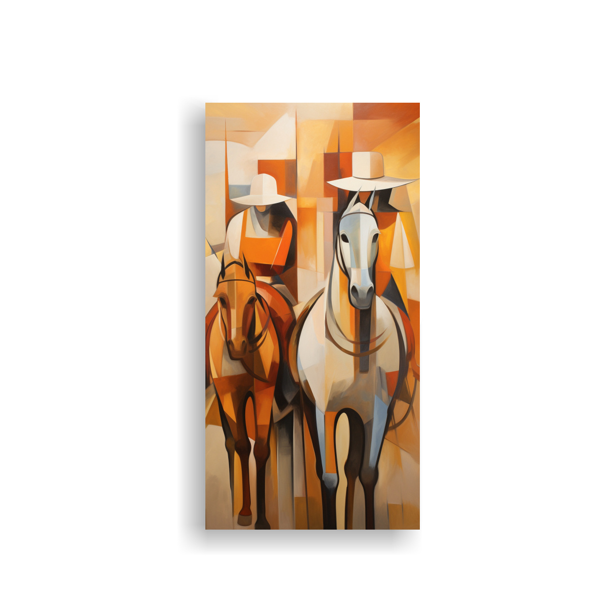 DecoCuadros te ofrece una pintura abstracta de personas en caballos en la distancia con colores en coral, plateado, azul marino grisaceo, dorado y chocolate Nuestros cuadros decorativos impresos en tela de alta calidad con bastidores de madera son los mejores del mercado Ofrecemos diseños exclusivos, entrega rápida y gratuita en Santiago y envío express a regiones