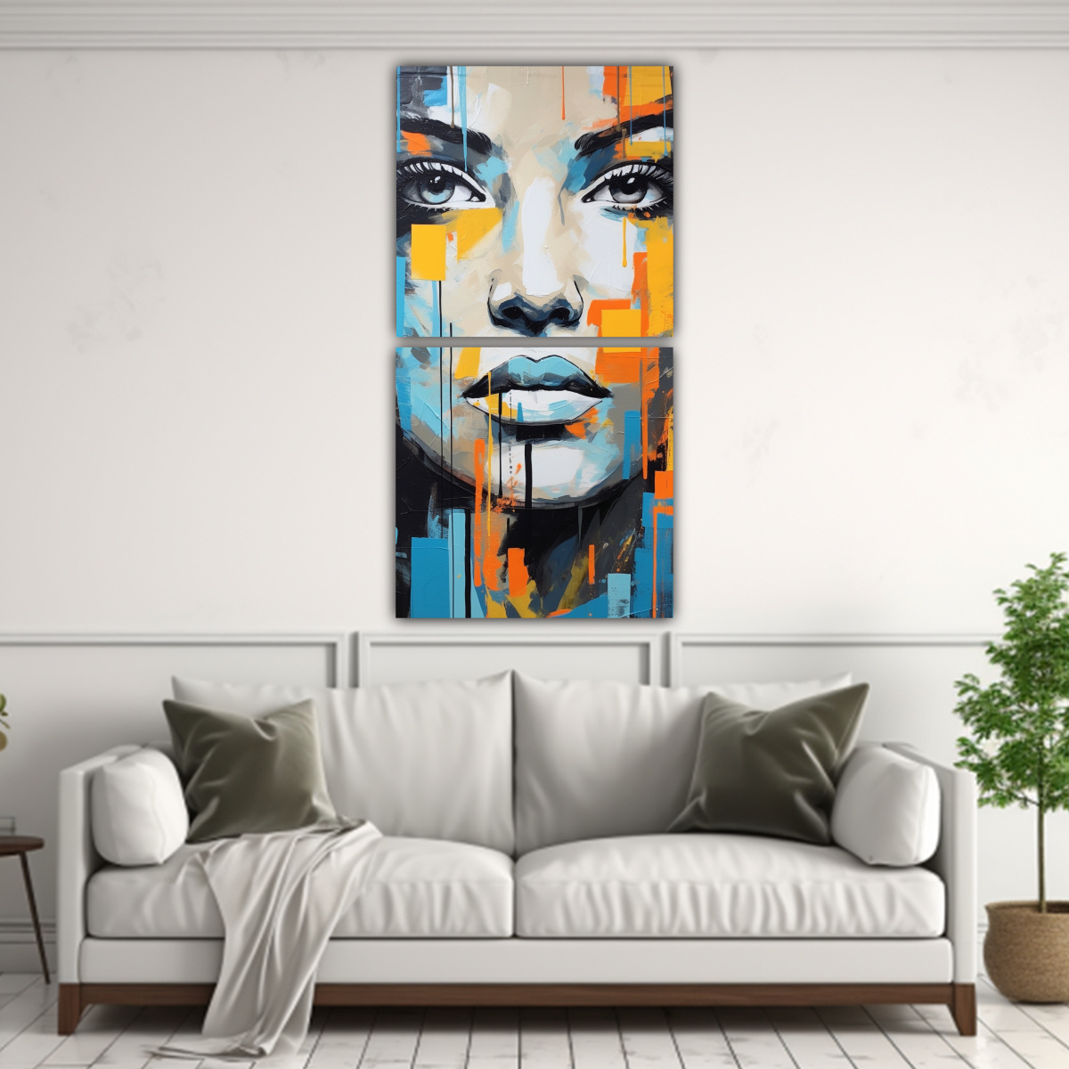 DecoCuadros ofrece cuadros decorativos impresos en tela de alta calidad con bastidores de madera Cuadro abstracto de retrato de mujer en lienzo con colores coral, azul marino grisaceo, plateado, gris, verde azulado, dorado y menta