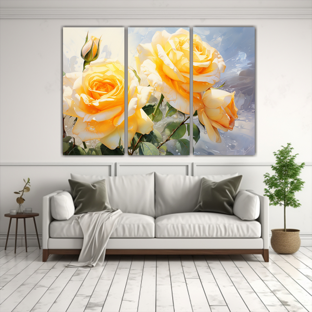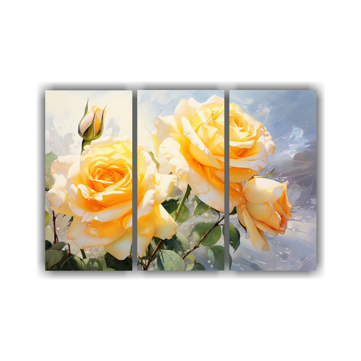 Renueva tu hogar con este cuadro abstracto de rosas amarillas y blancas en acuarela Dale un toque de elegancia y serenidad a tus espacios con nuestros diseños exclusivos Los colores dorado, azul marino grisaceo, beige, coral, gris, plateado y carmesí se fusionan para crear una obra única