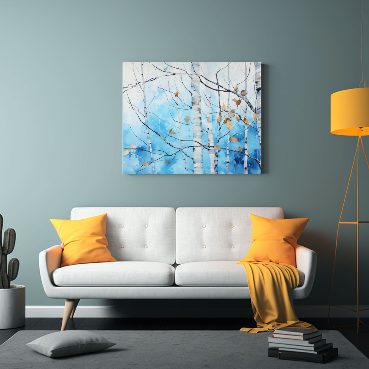 Este cuadro abstracto de un árbol de abedul en tonos azules sería ideal para decorar tu sala de estar o dormitorio, creando un ambiente sereno y elegante Combínalo con muebles en tonos neutros para resaltar su belleza y aportar armonía a la habitación