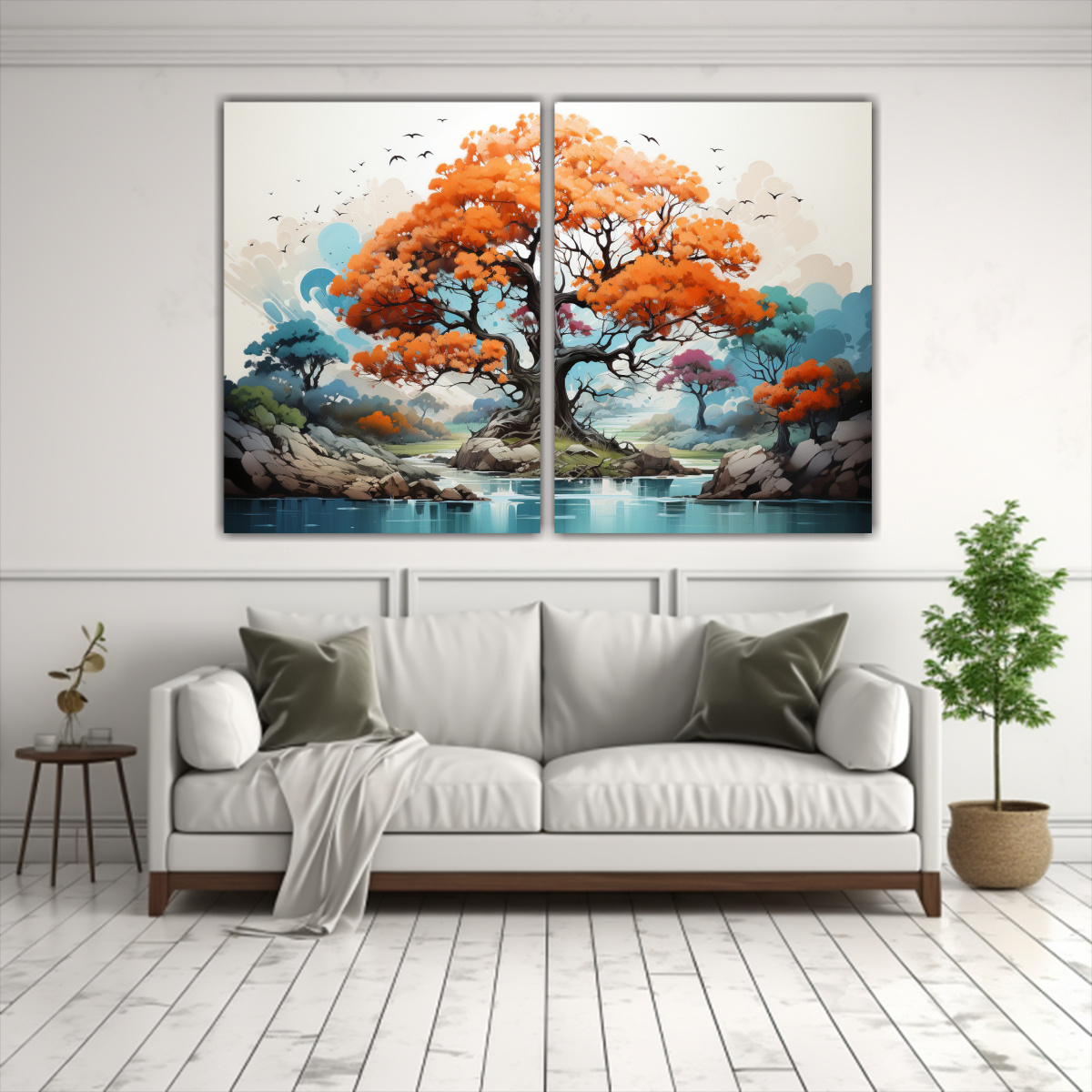 Este cuadro abstracto de un roble en colores turquesa y naranja sería ideal para decorar una sala de estar moderna Colócalo sobre un sofá beige para resaltar los tonos turquesa y combinar con cojines en tonos coral y menta para lograr un ambiente alegre y sofisticado