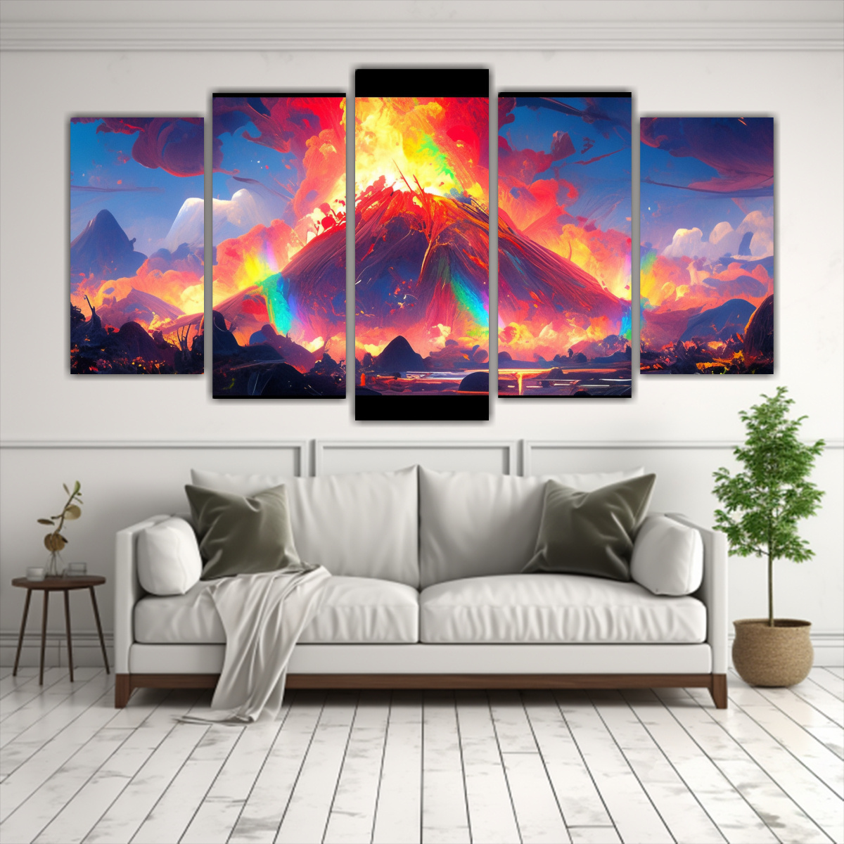 Pintura Abstracta De Un Volcán Con Arcoíris Y Colores Turquesa