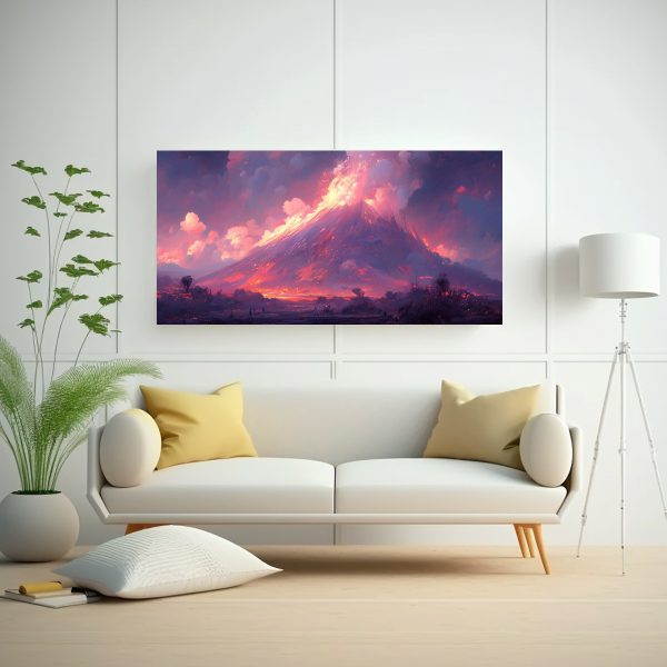 Este cuadro abstracto de un volcán con colores morados se vería magnífico en un salón con muebles neutros y detalles en tonos lila y coral Colócalo sobre un sofá gris para crear un punto focal impactante y elegante