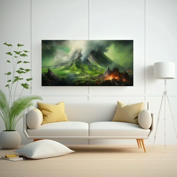 Para realzar la belleza de este cuadro abstracto de un volcán con colores verdes, te recomendamos colocarlo en un lugar destacado de tu sala de estar Combínalo con muebles en tonos neutros para crear un ambiente moderno y sofisticado