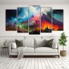 Este cuadro abstracto de un volcán con colores vibrantes sería ideal para colocar en la sala de estar sobre un sofá de color neutro para crear un impacto visual Combínalo con cojines en tonos coral y accesorios en turquesa para lograr un ambiente moderno y sofisticado