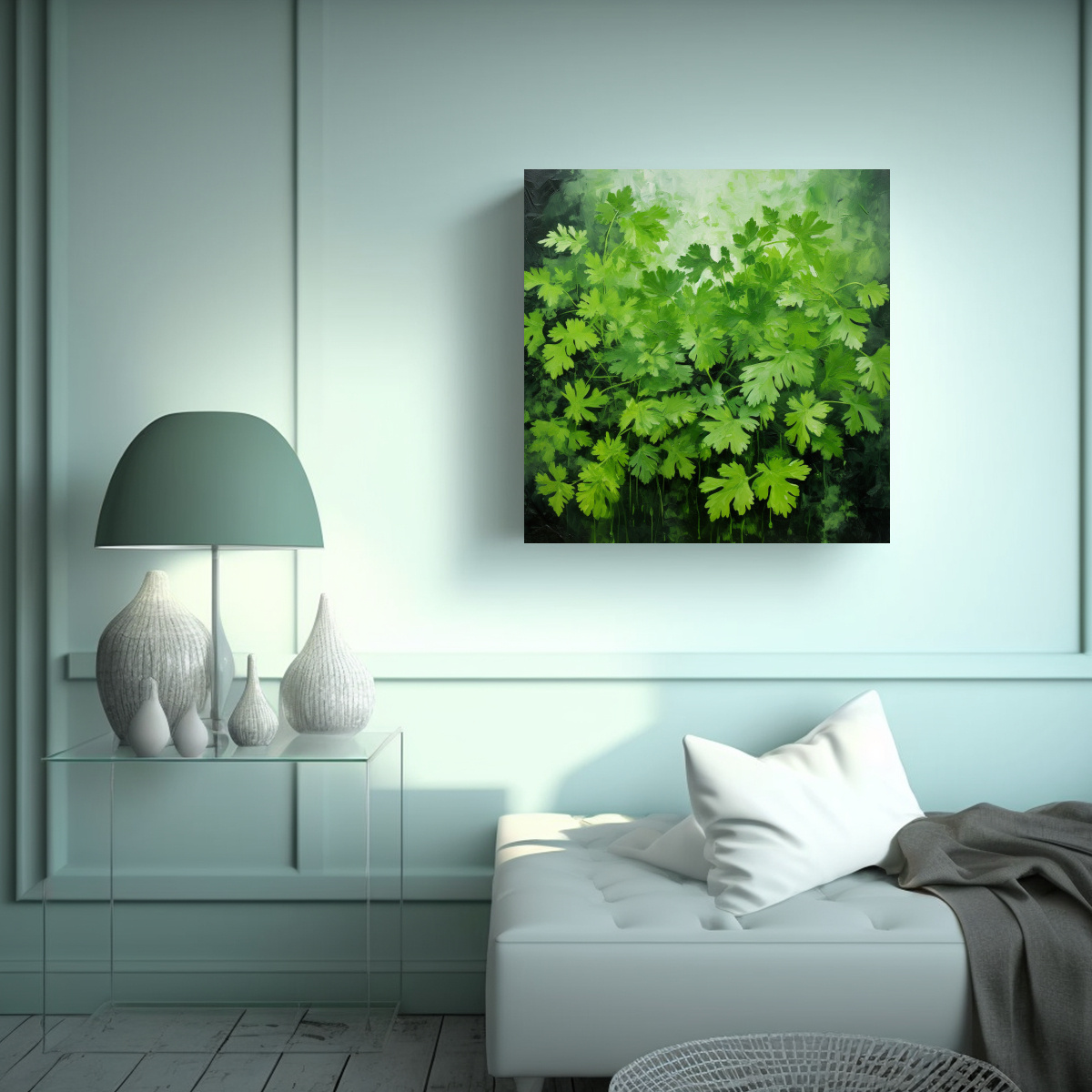 Este cuadro abstracto al Estilo óleo con hierbas de cilantro se verá espectacular en tu sala de estar Combínalo con muebles en tonos neutros para resaltar los colores y texturas de la pintura Puedes colocarlo sobre un sofá de color crema o beige, acompañado de cojines en tonos plateados y azules para crear un ambiente moderno y sofisticado