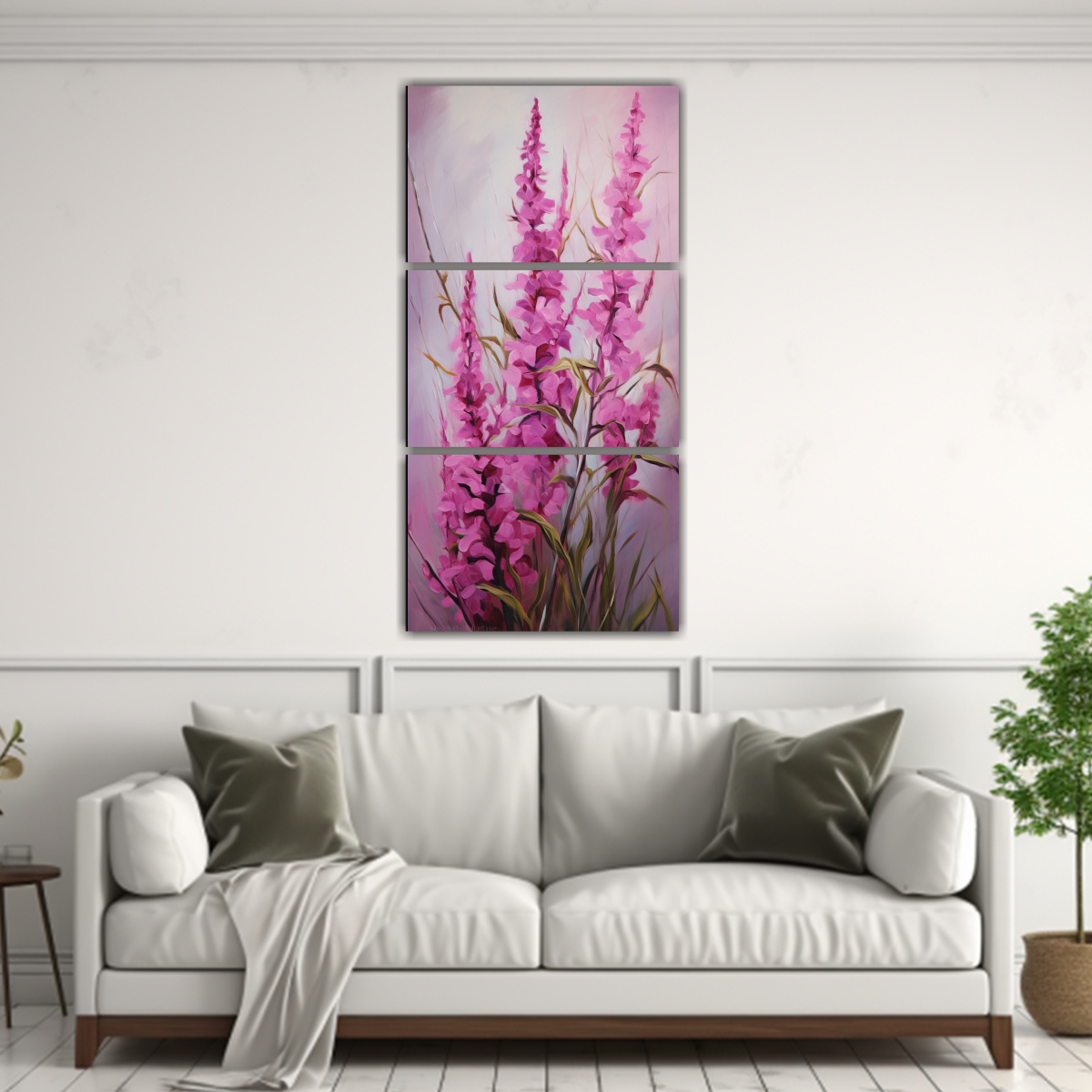 Este cuadro de las Tres Artes de Pared quedaría perfecto en la sala de estar sobre un sofá de tonos neutros, realzando la paleta de colores de la pintura y creando un ambiente sofisticado y moderno