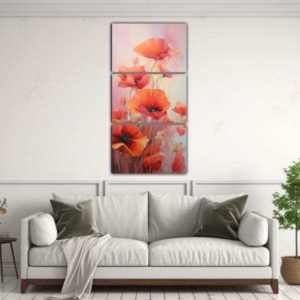 Este cuadro de amapolas abstractas en tres lienzos es ideal para colocar en el salón principal de tu hogar, sobre un sofá de color neutro para resaltar su belleza y añadir un toque de sofisticación Combínalo con cojines en tonos coral y gris para una decoración armoniosa