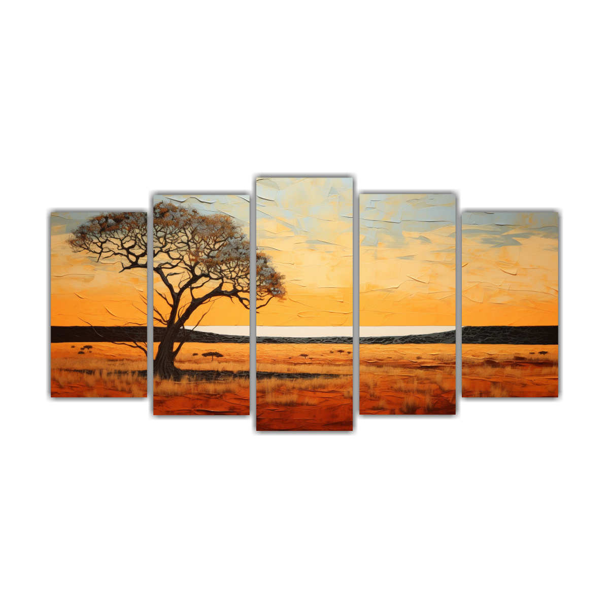 DecoCuadros te presenta el Set de 5 lienzos con pintura abstracta detallada de árboles en la sabana y el desierto Esta obra de arte viene en colores coral, plateado, azul marino grisaceo, chocolate, gris, amarillo claro y carmesí Nuestros cuadros decorativos están impresos en tela de alta calidad, montados en bastidores de madera, y tienen diseños exclusivos de nuestra tienda Te ofrecemos la mejor calidad del mercado y los precios más económicos Además, realizamos entregas rápidas y gratuitas en Santiago, y enviamos a regiones de forma express