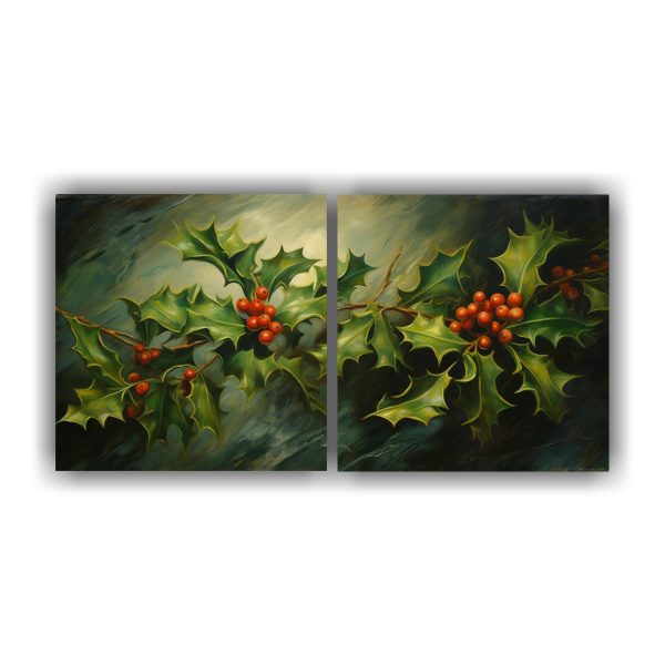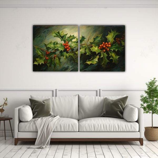 Este cuadro de hojas de acebo en tonos azul marino grisaceo, gris, chocolate, carmesí y mostaza sería ideal para realzar la pared sobre un sofá de color crema, creando un contraste elegante y moderno Complementa con cojines en tonos de la pintura para lograr una decoración armoniosa