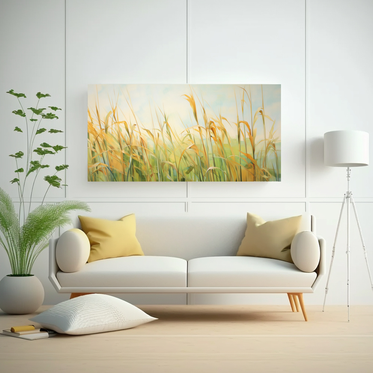 Este cuadro abstracto de juncos de espadaña en estilo Estilo óleo sería perfecto para colocar en el área de la sala de estar, creando un ambiente relajante y moderno Combínalo con muebles en tonos neutros para resaltar su belleza y darle un toque de sofisticación a la habitación
