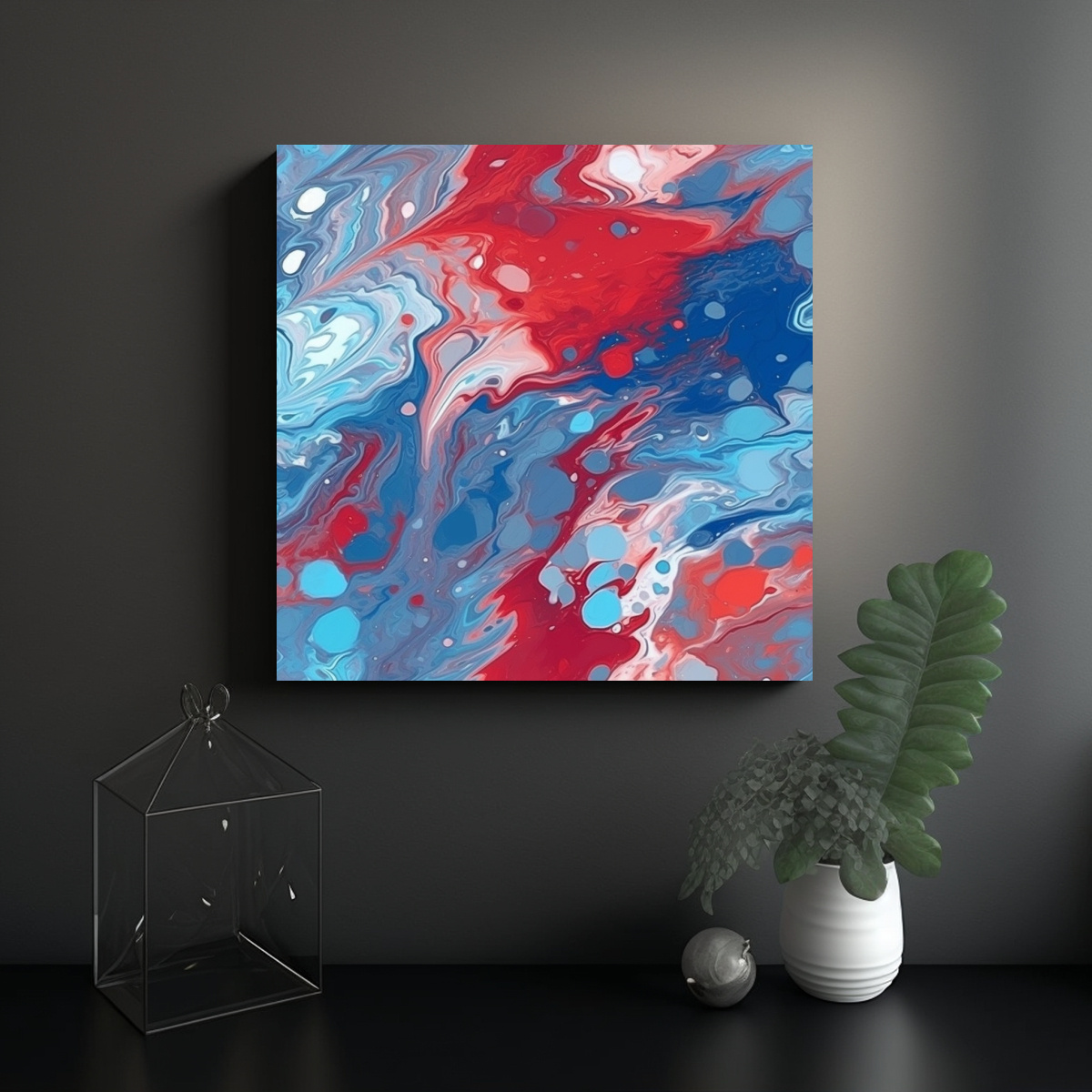 Este cuadro se vería espectacular en una pared blanca, creando un impacto visual llamativo y elegante Combínalo con muebles en tonos neutros como beige o gris para resaltar sus colores vibrantes Añade cojines en tonos azules y rojos para complementar la decoración ¡Crea un espacio único y lleno de estilo con esta increíble obra de arte!