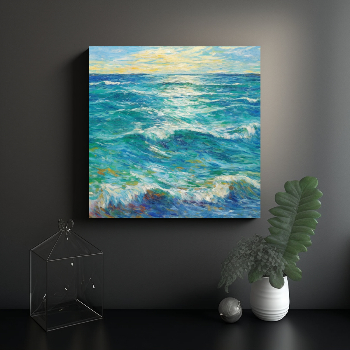 Este hermoso cuadro se vería perfecto en el salón principal de tu casa, sobre un sofá de color neutro o una pared blanca para resaltar su belleza Combínalo con cojines en tonos azules y accesorios plateados para una decoración moderna y sofisticada