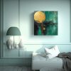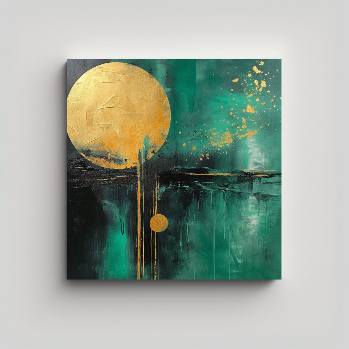 Este cuadro abstracto elegante con detalles dorados y verdes sería ideal para decorar un salón contemporáneo Puedes colocarlo sobre un sofá gris claro para crear un contraste sofisticado Combínalo con cojines y cortinas en tonos turquesa y menta para resaltar los colores del cuadro Completa el ambiente con elementos decorativos en tonos plateados para agregar un toque de elegancia ¡Transforma tu espacio con este cuadro exclusivo de DecoCuadros!