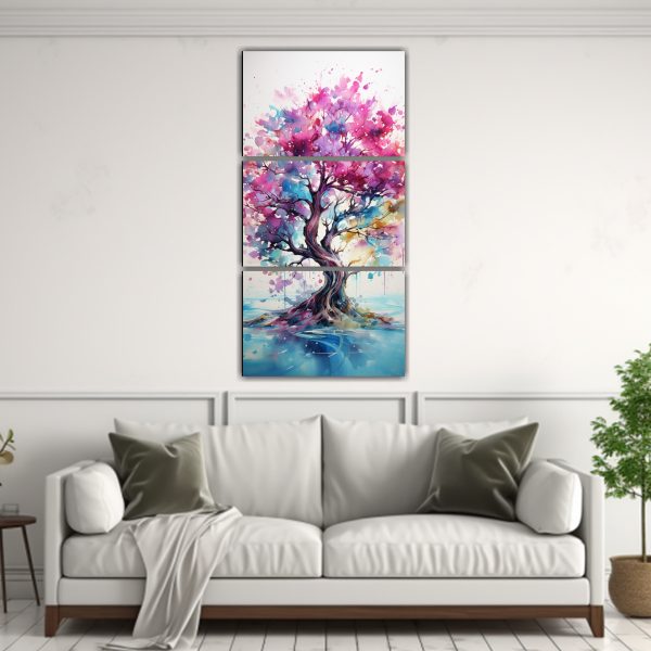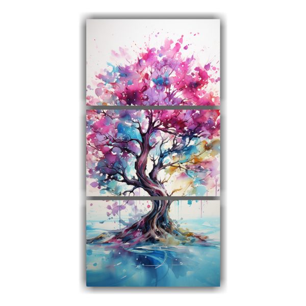 Pintura Abstracta Elegante De Tres Lienzos Con árbol De Olivo En Colores Turquesa Y Rosa